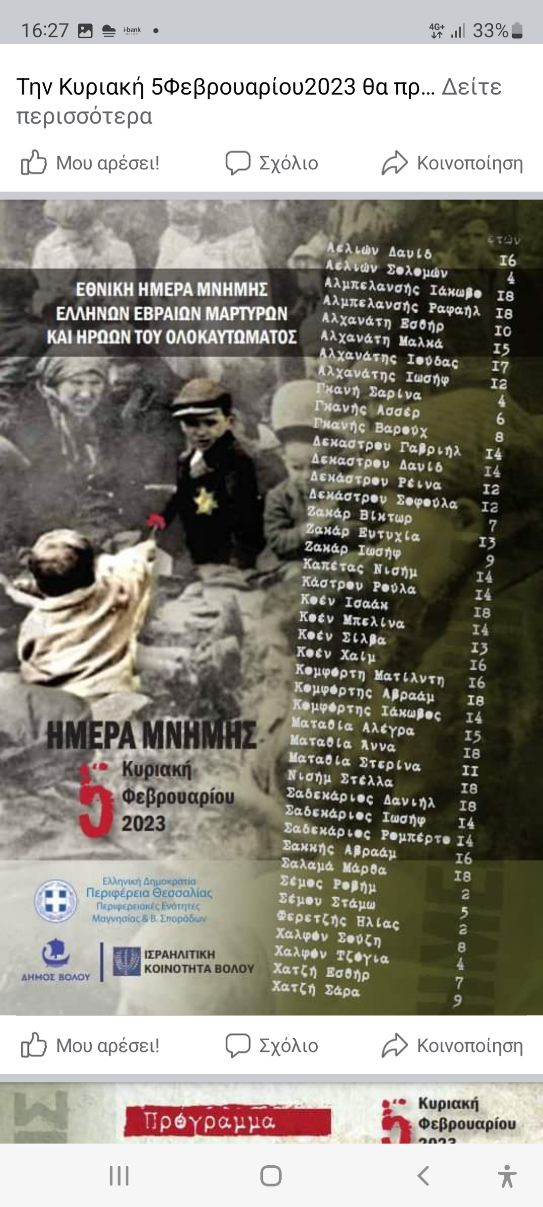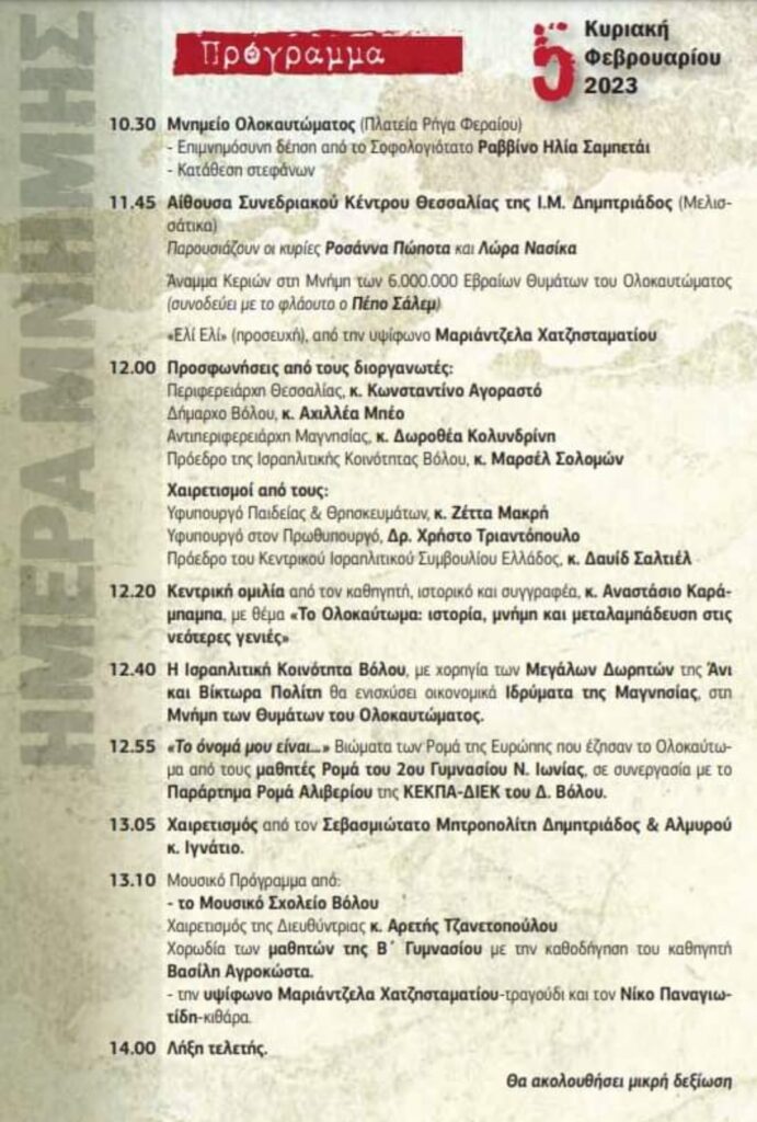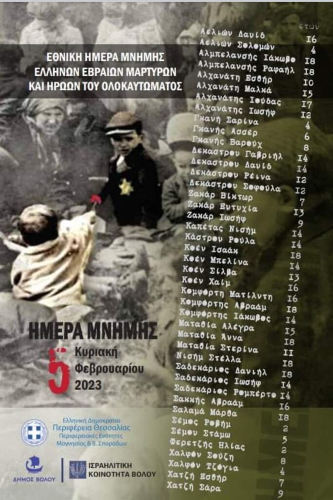 Την Κυριακή 5Φεβρουαρίου2023 θα πραγματοποιηθούν εκδηλώσεις για να τιμηθεί η «Εθνική Ημέρα Μνήμης Ελλήνων Εβραίων Μαρτύρων και Ηρώων του Ολοκαυτώματος» σε συνδιοργάνωση της Περιφέρειας Θεσσαλίας-Περιφερειακές Ενότητες Μαγνησίας& Σποράδων ,το Δήμο Βόλο και την Ισραηλιτική Κοινότητα Βόλου και με τη στήριξη της Ι.Μ.Δημητρίαδος & Αλμυρού.