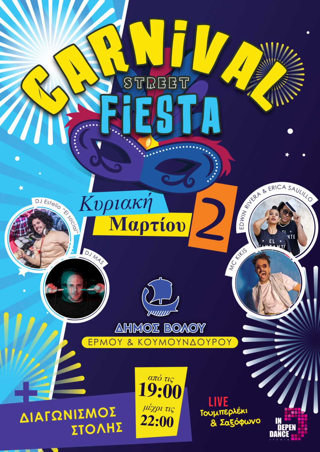 Ο Δήμος Βόλου σε συνεργασία με την σχολή χορού Independance Studio στο Βόλο, θα διασκεδάσουν τον κόσμο με latin και mainstream μουσικές, happenings, ομαδικά παιχνίδια, διαγωνισμό αποκριάτικης στολής, standupcomedy, χορό και πολλά άλλα δρώμενα!