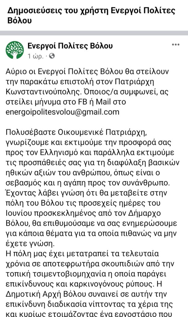 Σύμφωνα με ανάρτηση – δελτίο τύπου στην σελίδα της Κίνησης στο Facebook, αύριο η Αυτοδιοικητική και Περιβαλλοντική Κίνηση Πολιτών “Ενεργοί Πολίτες Βόλου” που εκπροσωπεί ο πανεπιστημιακός Μάρκος Βαξεβανόπουλος, θα στείλουν επιστολή και video στον Πατριάρχη Κωνσταντινούπολης για τον Αχιλλέα Μπέο. Μάλιστα όπως σημειώνουν “όποιος/α συμφωνεί, καλείται να στείλει μήνυμα στη σελίδα των ενεργών πολιτών στο FB ή Mail στο energoipolitesvolou@gmail.com”