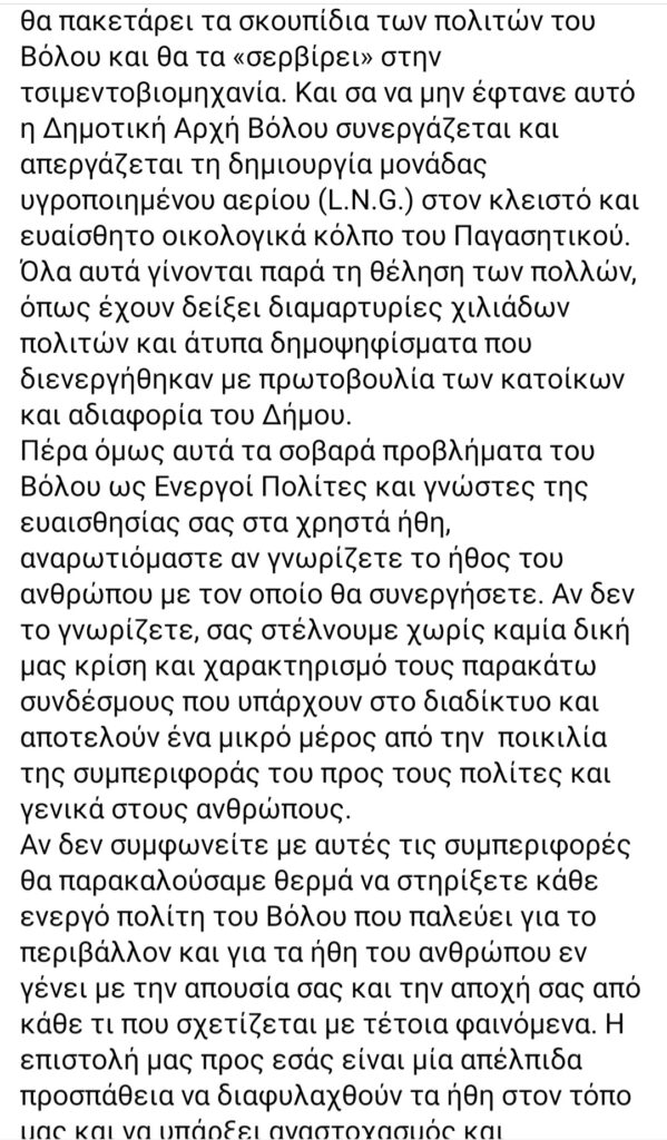 Αν δεν συμφωνείτε με αυτές τις συμπεριφορές θα παρακαλούσαμε θερμά να στηρίξετε κάθε ενεργό πολίτη του Βόλου που παλεύει για το περιβάλλον και για τα ήθη του ανθρώπου εν γένει με την απουσία σας και την αποχή σας από κάθε τι που σχετίζεται με τέτοια φαινόμενα. Η επιστολή μας προς εσάς είναι μία απέλπιδα προσπάθεια να διαφυλαχθούν τα ήθη στον τόπο μας και να υπάρξει αναστοχασμός και αυτοκριτική σε ανοίκειες συμπεριφορές που έχουν γίνει ο κανόνας στον Βόλο. Αν δοθεί συγχωροχάρτι σε τέτοια κρούσματα, η ηθική κατάπτωση είναι σίγουρη για τα επόμενα χρόνια”.