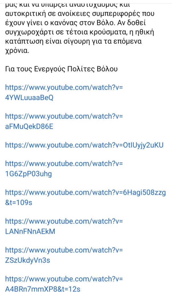 Πέρα όμως αυτά τα σοβαρά προβλήματα του Βόλου ως Ενεργοί Πολίτες και γνώστες της ευαισθησίας σας στα χρηστά ήθη, αναρωτιόμαστε αν γνωρίζετε το ήθος του ανθρώπου με τον οποίο θα συνεργήσετε. Αν δεν το γνωρίζετε, σας στέλνουμε χωρίς καμία δική μας κρίση και χαρακτηρισμό τους παρακάτω συνδέσμους που υπάρχουν στο διαδίκτυο και αποτελούν ένα μικρό μέρος από την ποικιλία της συμπεριφοράς του προς τους πολίτες και γενικά στους ανθρώπους.