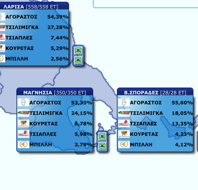 Συμφωνα με τα τελικά αποτελέσματα περαν του κ.Σλατούδη απο τις Βορειες Σποράδες που εκλεχτηκε με τον συνδυασμο του Κ.Αγοραστου, οι έδρες στο Περιφερειακο Συμβούλιο που καταλαμβάνουν οι συνδυασμοί στην ηπειρωτική Μαγνησία είναι: