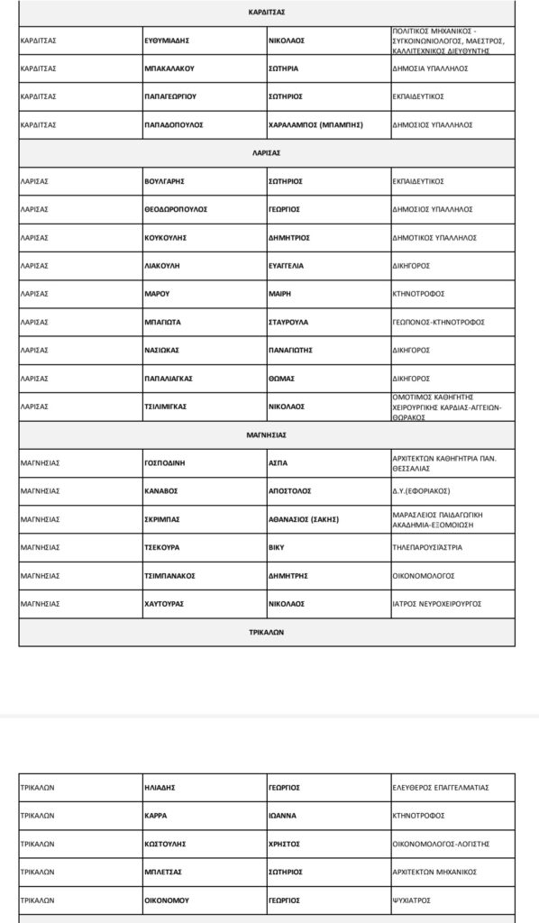 Στη Λάρισα από τους 11 υποψηφίους ανακοινώθηκαν οι εννιά και είναι οι: Παπαλιάγκας Θωμάς δικηγόρος, Τσιλιμίγκας Νικόλαος γιατρός, Βούλγαρης Σωτήρης εκπαιδευτικός, Θεοδωρόπουλος Γιώργος δημόσιος υπάλληλος, Κουκούλης Δημήτριος δημοτικός υπάλληλος, Λιακούλη Ευαγγελία δικηγόρος, Μάρου Μαίρη κτηνοτρόφος, Μπαργιώτα Σταυρούλα γεωπόνος και Νασιώκας Παναγιώτης δικηγόρος
