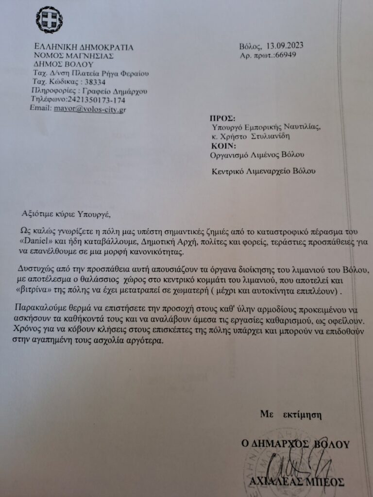 “Με μεγάλη μας έκπληξη αναγνώσαμε την από 13-09-23 επιστολή του Δημάρχου Βόλου Αχιλλέα Μπέου προς το νέο ΥΝΑΝΠ κ. Χρήστο Στυλιανίδη .