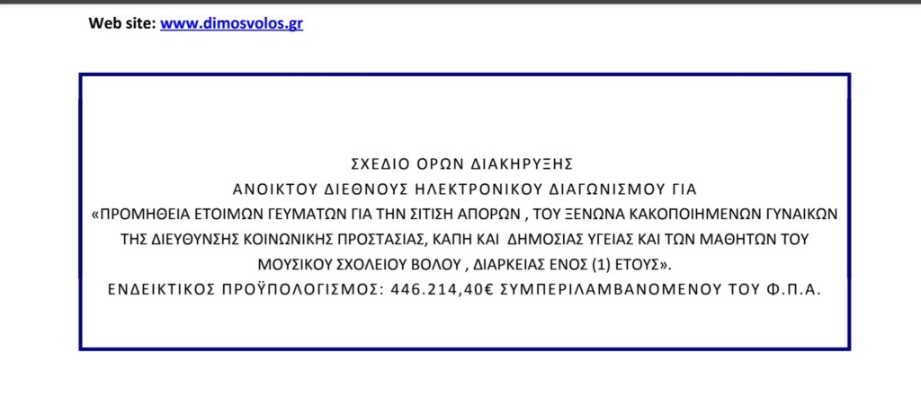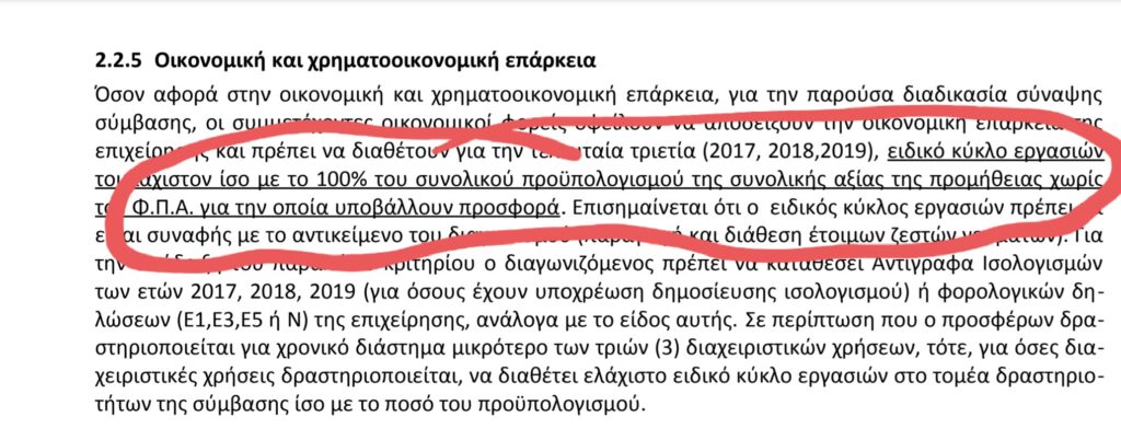Γιατί υπάρχει ο όρος στην παράγραφο της οικονομικής και χρηματοοικονομικής επάρκειας του διαγωνισμού του Δήμου Βόλου για την προμήθεια έτοιμων γευμάτων για, την σίτιση άπορων του Ξενώνα Κακοποιημένων Γυναικών, των ΚΑΠΗ και του Μουσικού Σχολείου, ότι οι συμμετέχοντες θα πρέπει να διαθέτουν την τελευταία τριετία “ειδικο κύκλο εργασιών τουλάχιστον ίσο με το 100% του συνολικού προϋπολογισμού της συνολικής αξίας της προμήθειας” άρα, 446.214 ευρώ;