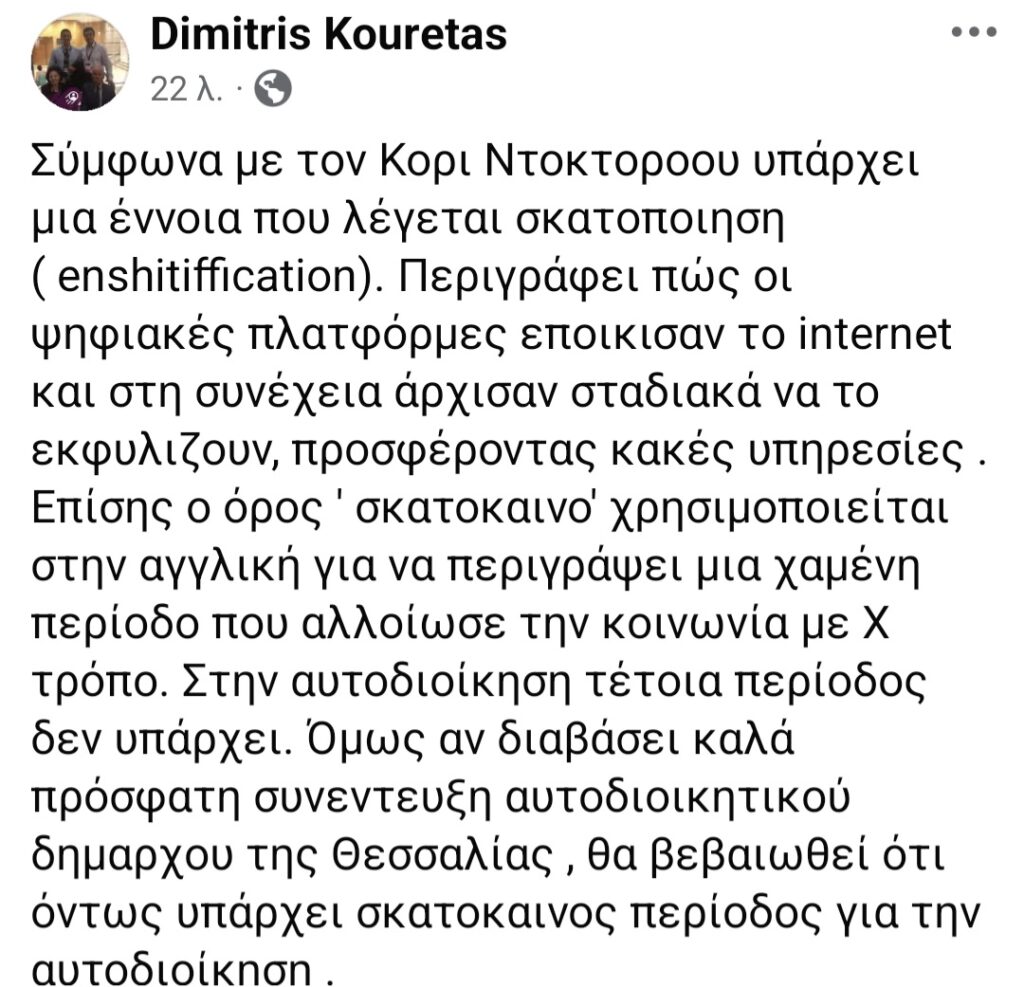 Ακόμη μια δεικτική ανάρτηση που φωτογραφίζει τον Αχιλλέα Μπέο επιφύλασσε ως απάντηση ο Δημήτρης Κουρέτας μετά τις νέες κατηγορίες εις βάρος του απο τον Δήμαρχο Βόλου περι λαϊκισμού και καραγκιοζιλίκια που είπε σε τηλεοπτική του συνέντευξη για την στάση του Περιφερειάρχη στο συλλαλητήριο για το LNG στον Παγασητικό. Ο Περιφερειάρχης μιλά “σκατόκαινος περίοδος για την αυτοδιοίκηση” στέλνοντας το σαφές του μήνυμα. Η ανάρτηση: