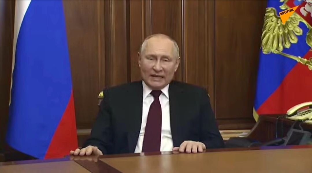 Ξεκινώντας το διάγγελμά του ο Ρώσος πρόεδρος μίλησε για την ιστορία της Σοβιετικής Ένωσης και της Ουκρανίας, λέγοντας πως η ανατολική Ουκρανία είναι αρχαία ρωσική γη και αναπόσπαστο μέρος της ρωσικής ιστορίας. Η σύγχρονη Ουκρανία είναι δημιούργημα της σοβιετικής Ρωσίας, είπε ο Βλ. Πούτιν.