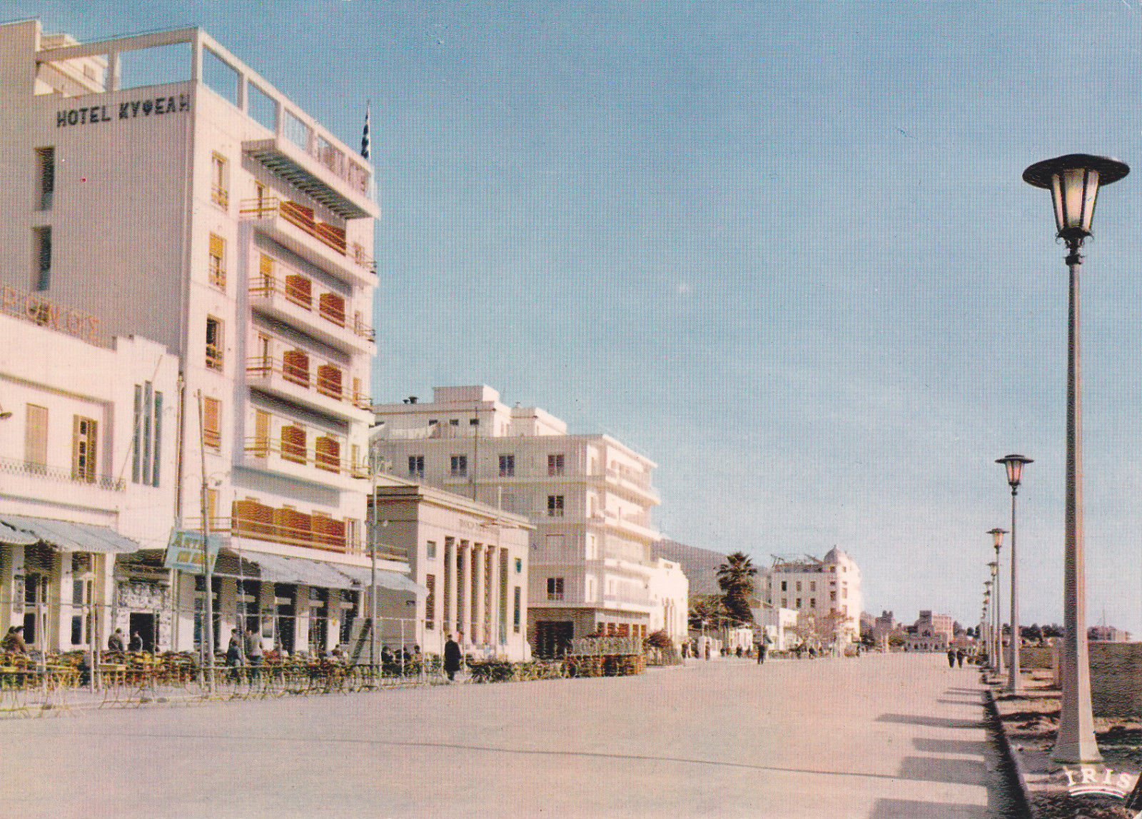 Οδός Αργοναυτών. Το ξενοδοχείο “Κυψέλη”, δίπλα στο κτίριο της Τράπεζας της Ελλάδος. Στο βάθος φαίνεται η καπναποθήκη Παπαστράτου.