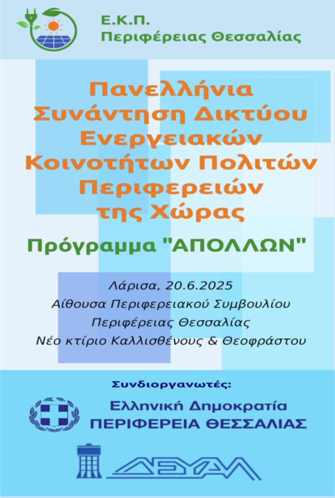 Την Παρασκευή 20 Ιουνίου και ώρα 10.00 στην αίθουσα του Περιφερειακού Συμβουλίου της Περιφέρειας Θεσσαλίας στην πόλη της Λάρισας (νέο κτίριο, Καλλισθένους και Θεοφράστου), θα πραγματοποιηθεί η Πανελλήνια Συνάντηση των Ενεργειακών Κοινοτήτων Πολιτών των Περιφερειών της Χώρας που προέκυψε από πρωτοβουλία της Ενεργειακής Κοινότητας Πολιτών της Περιφέρειας Θεσσαλίας και έγινε ομόφωνα αποδεκτή από τις υπόλοιπες ΕΚΠ που συμμετείχαν στη διαδικτυακή συνάντηση των ΕΚΠ των Περιφερειών της Χώρας την Τετάρτη 28/5/2025.Οι ΕΚΠ που θα συμμετάσχουν με εκπρόσωπό τους είναι 12 από όλες τις Περιφέρειες που έχουν συστήσει ΕΚΠ βάσει του προγράμματος “ΑΠΟΛΛΩΝ“ και είναι αυτές της Θεσσαλίας, του Νοτίου Αιγαίου, της Κρήτης, της Ανατολικής Μακεδονίας Θράκης, των Ιόνιων Νήσων, της Πελοποννήσου, της Κεντρικής Μακεδονίας, της Στερεάς Ελλάδας, της Δυτικής Μακεδονίας, της Ηπείρου, και του Βορείου Αιγαίου.Θέμα της συνάντησης είναι η πορεία υλοποίησης του προγράμματος “ΑΠΟΛΛΩΝ” και ο μελλοντικός ρόλος των Ενεργειακών Κοινοτήτων Πολιτών. Στη συνάντηση έχει προσκληθεί και η ηγεσία του Υπουργείου Περιβάλλοντος και Ενέργειας. Συνδιοργανωτές της εκδήλωσης είναι η Περιφέρεια Θεσσαλίας και η ΔΕΥΑ Λάρισας.