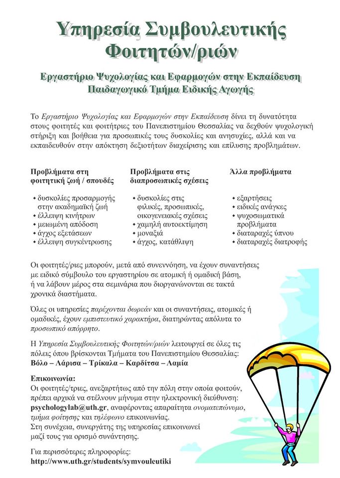 Η Υπηρεσία Συμβουλευτικής Φοιτητών/ριών του Εργαστηρίου Ψυχολογίας και Εφαρμογών στην Εκπαίδευση (ΠΤΕΑ), δίνει τη δυνατότητα στους φοιτητές και τις φοιτήτριες του Πανεπιστημίου Θεσσαλίας να δεχθούν ψυχολογική στήριξη και βοήθεια για προσωπικές τους δυσκολίες και ανησυχίες και να εκπαιδευτούν στην απόκτηση δεξιοτήτων διαχείρισης και επίλυσης προβλημάτων.