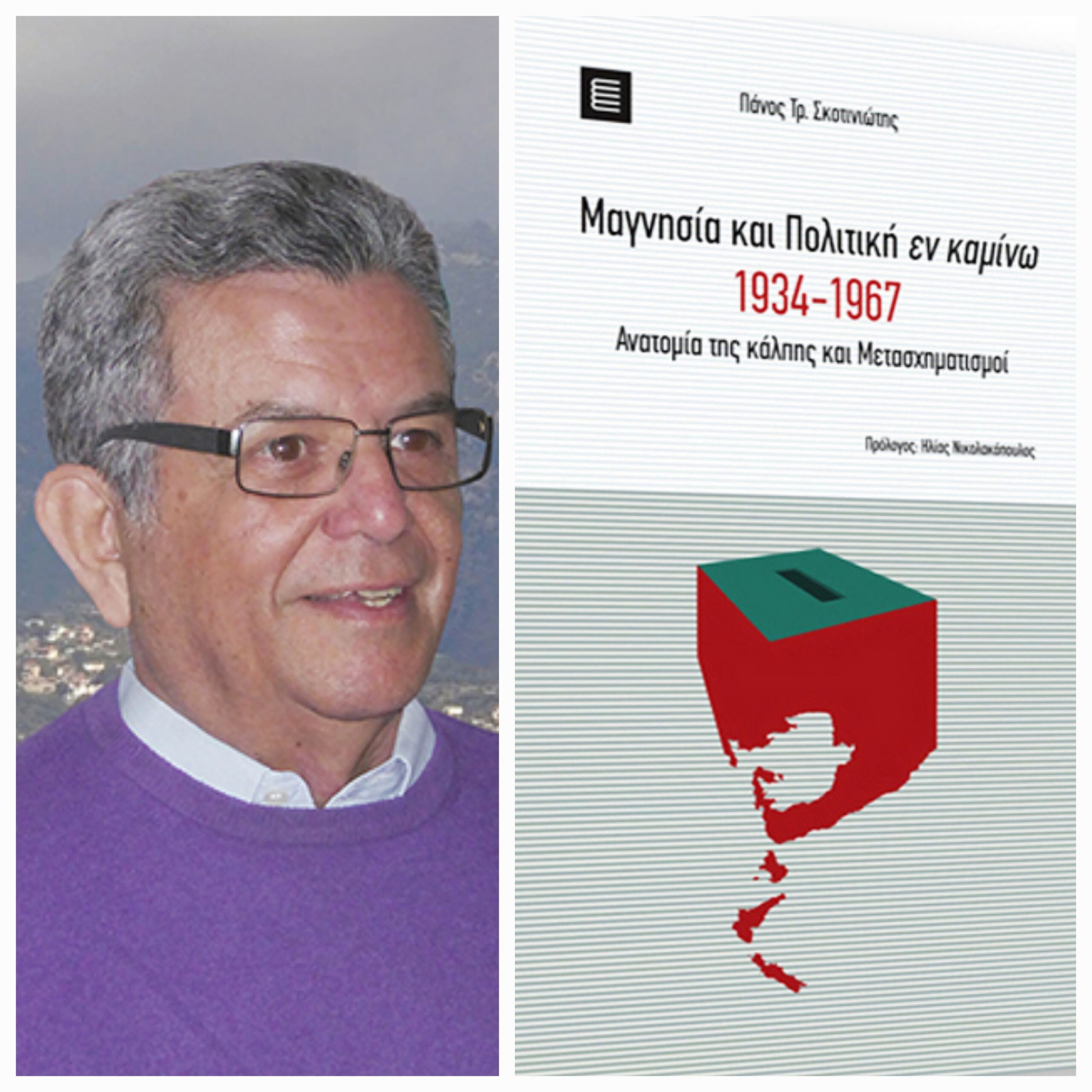 Κυκλοφόρησε από τις Πανεπιστημιακές Εκδόσεις Θεσσαλίας το βιβλίο του Πάνου Σκοτινιώτη «Μαγνησία και Πολιτική εν καμίνω, 1934-1967. Ανατομία της κάλπης και Μετασχηματισμοί». Το βιβλίο προλογίζει ο αείμνηστος, ομότιμος καθηγητής, Ηλίας Νικολακόπουλος, με την ανεκτίμητη προσφορά στην επιστήμη και την κοινωνία. Το εξώφυλλο έχει σχεδιάσει ο Βολιώτης εικαστικός-καθηγητής Αλέξανδρος Ψυχούλης.