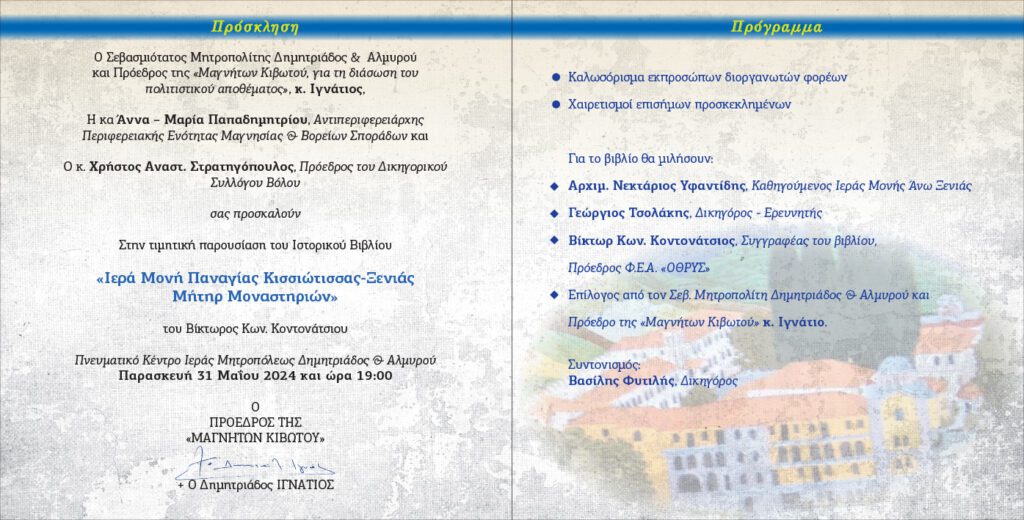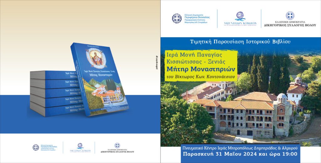 Να παρουσιαστεί αρχικά το βιβλίου του Ιστορικού – Ερευνητή και επί πολλά χρόνια προέδρου της Φιλάρχαιου Εταιρεία Αλμυρού “ΟΘΡΥΣ” Βίκτωρος Κων. Κοντονάτσιου με τίτλο: «Ιερά Μονή Παναγίας Κισσιώτισσας-Ξενιάς