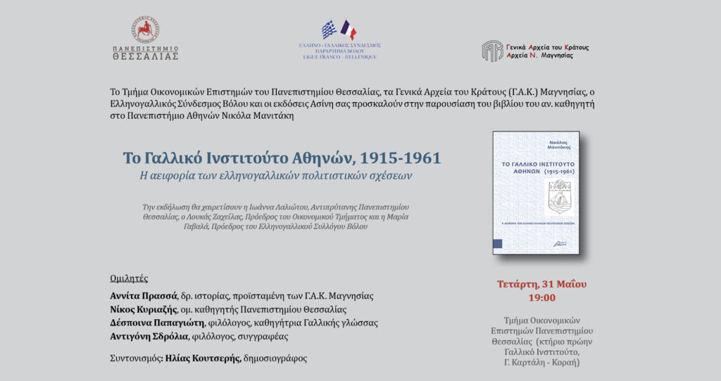 Το βιβλίο του αν. καθηγητή του Πανεπιστημίου Αθηνών Νικόλα Μανιτάκη, «Το Γαλλικό Ινστιτούτο Αθηνών (1915-1961). Η αειφορία των ελληνογαλλικών πολιτιστικών σχέσεων» (εκδ. «Ασίνη») παρουσιάζεται την Τετάρτη 31 Μαΐου, στις 7 μ.μ., στον Βόλο, στο κτήριο του πρώην Γαλλικού Ινστιτούτου (Γ. Καρτάλη και Κοραή) του Τμήματος Οικονομικών Επιστημών.