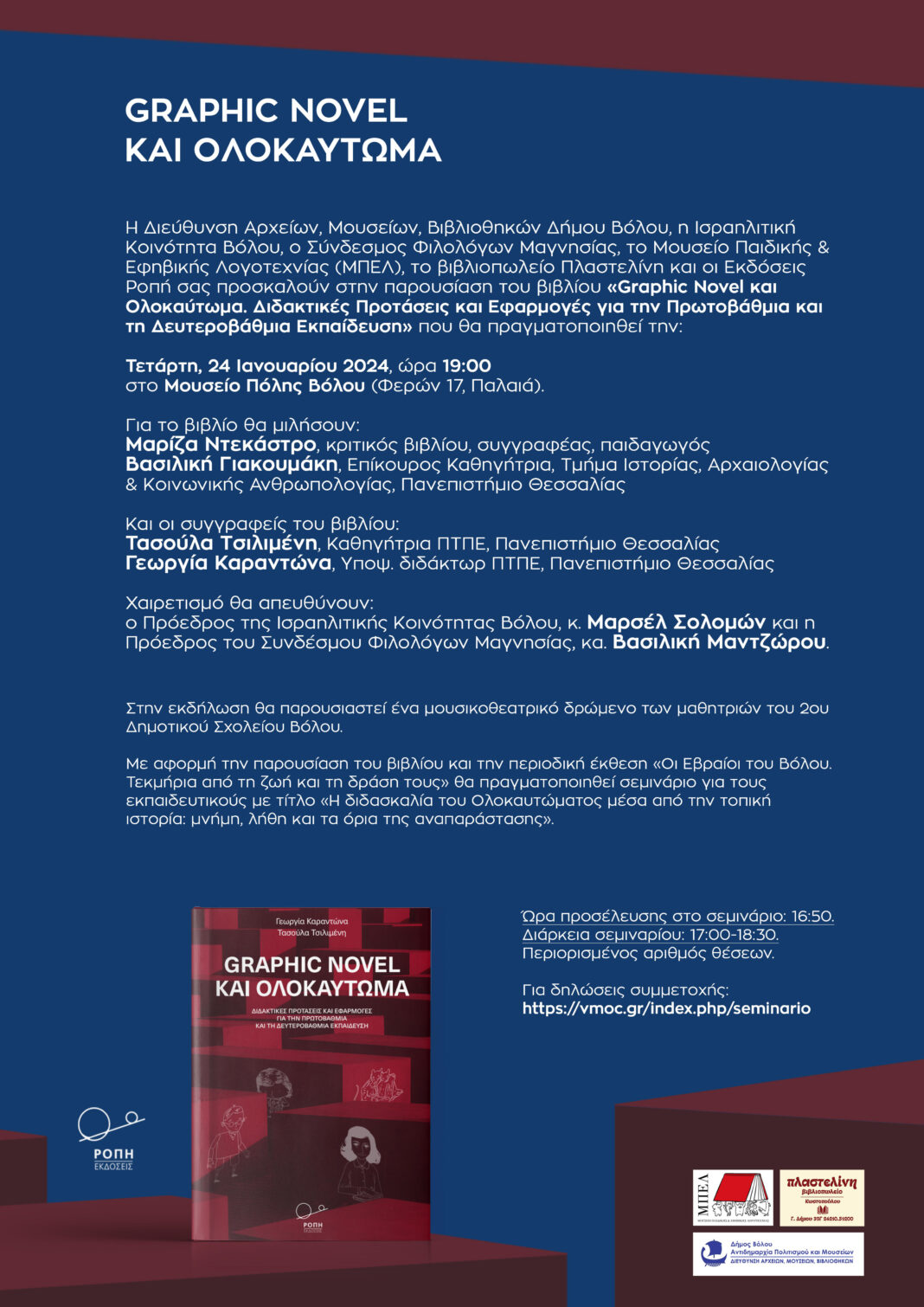 Την Τετάρτη 24 Ιανουαρίου 2024, στις 7.00 το απόγευμα, στο Μουσείο της Πόλης του Βόλου, θα πραγματοποιηθεί η παρουσίαση του βιβλίου “Graphic Novel και Ολοκαύτωμα, Διδακτικές προτάσεις και Εφαρμογές για την Πρωτοβάθμια και τη Δευτεροβαθμια Εκπαιδευση”.