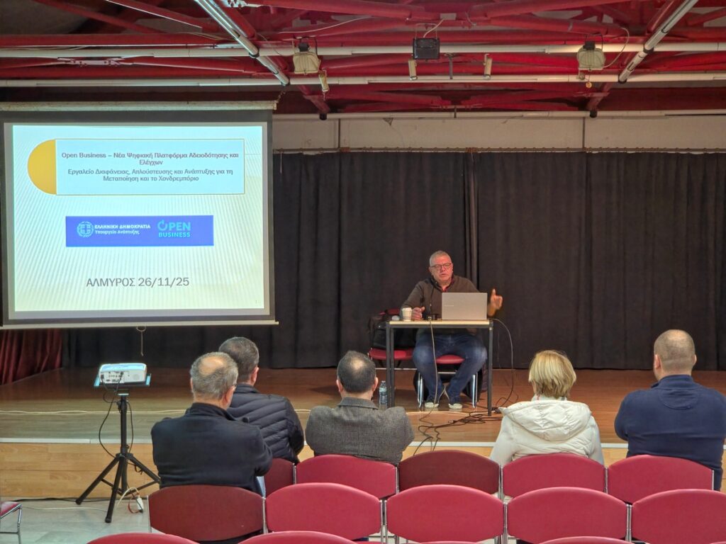 Παρουσία μελών της εμπορικής και επαγγελματικής κοινότητας του Αλμυρού πραγματοποιήθηκε το απόγευμα της Τετάρτης 26 Νοεμβρίου η ενημερωτική εκδήλωση με θέμα «Η νέα ψηφιακή πλατφόρμα ΟΠΣ Άσκησης Δραστηριοτήτων και Ελέγχων- Open Business: Εργαλείο Διαφάνειας, Απλούστευσης και Ανάπτυξης για τη Μεταποίηση και το Χονδρεμπόριο».