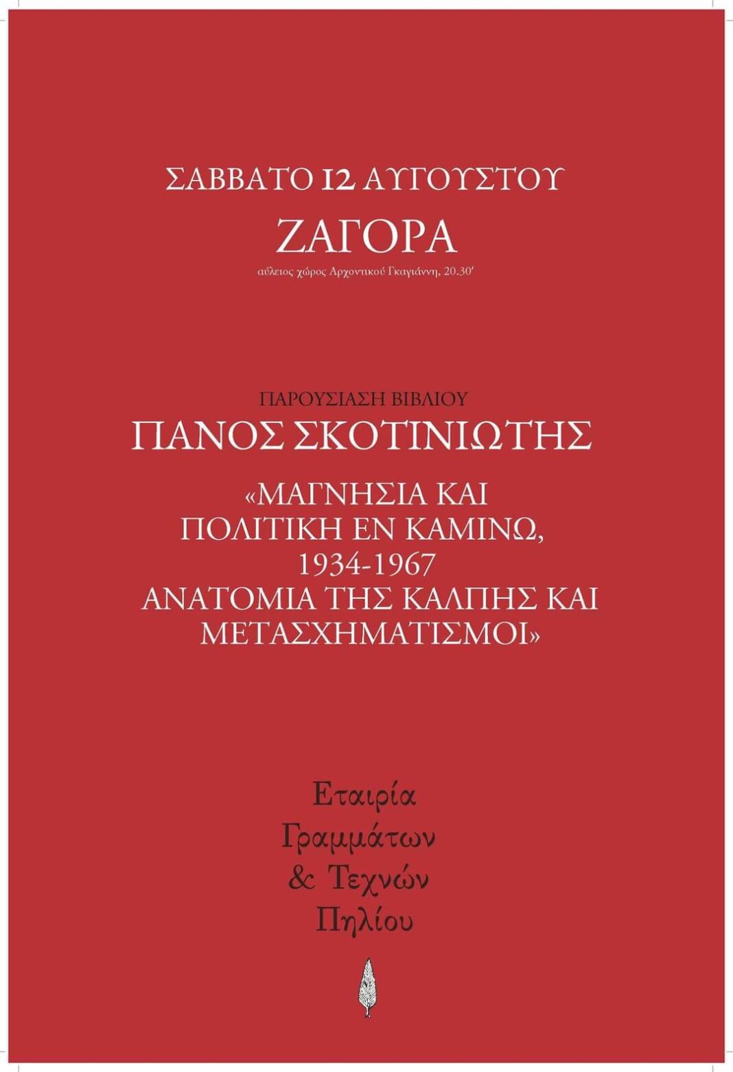 Στο πλαίσιο των εκδηλώσεων που διοργανώνει το καλοκαίρι – φθινόπωρο 2023 η Εταιρία Γραμμάτων και Τεχνών Πηλίου, παρουσιάζεται το Σάββατο 12 Αυγούστου στη Ζαγορά, στις 8.30 μ.μ., στον αύλειο χώρο του Αρχοντικού Κωνσταντινίδη (Γκαγιάννη),