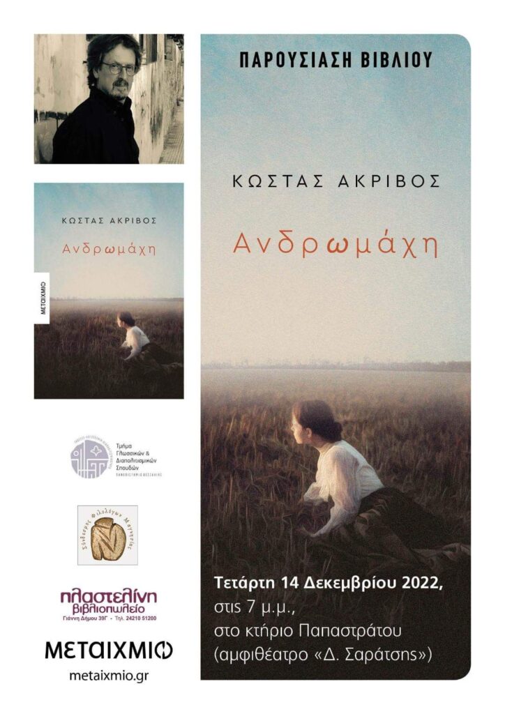 Την ερχόμενη Τετάρτη (14/12), στις 7 το απόγευμα, παρουσιάζουμε την “Ανδρωμάχη” στο Πανεπιστήμιο Θεσσαλίας (κτήριο Παπαστράτου, αμφιθέατρο ΄΄Δ. Σαράτσης΄΄), μαζί με τον Σπύρο Κιοσσέ, τη Βίκυ Μαντζώρου, την Ιουλία Βαλατσού και τη Ροσσάνα Πώποτα. Και, βέβαια, παρέα με όλους εσάς!