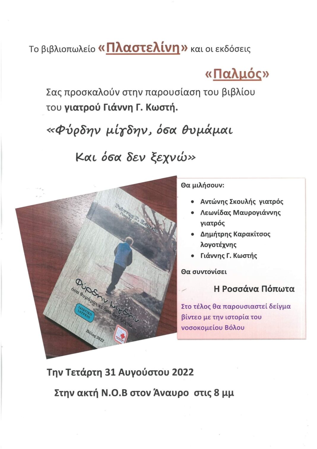 Το βιβλιοπωλείο «Πλαστελίνη» και οι εκδόσεις «Παλμός», σας προσκαλούν στην παρουσίαση του βιβλίου του γιατρού Γιάννη Γ. Κωστή.