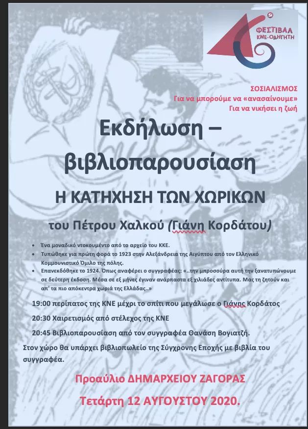 Εκδήλωση – βιβλιοπαρουσίαση στις 12 Αυγούστου στη Ζαγορά με την “Κατήχηση των χωρικών” του Πέτρου Χαλκού (Γιάνη Κορδάτου). Είναι ένα μοναδικό ντοκουμέντο από το αρχείο του ΚΚΕ.
