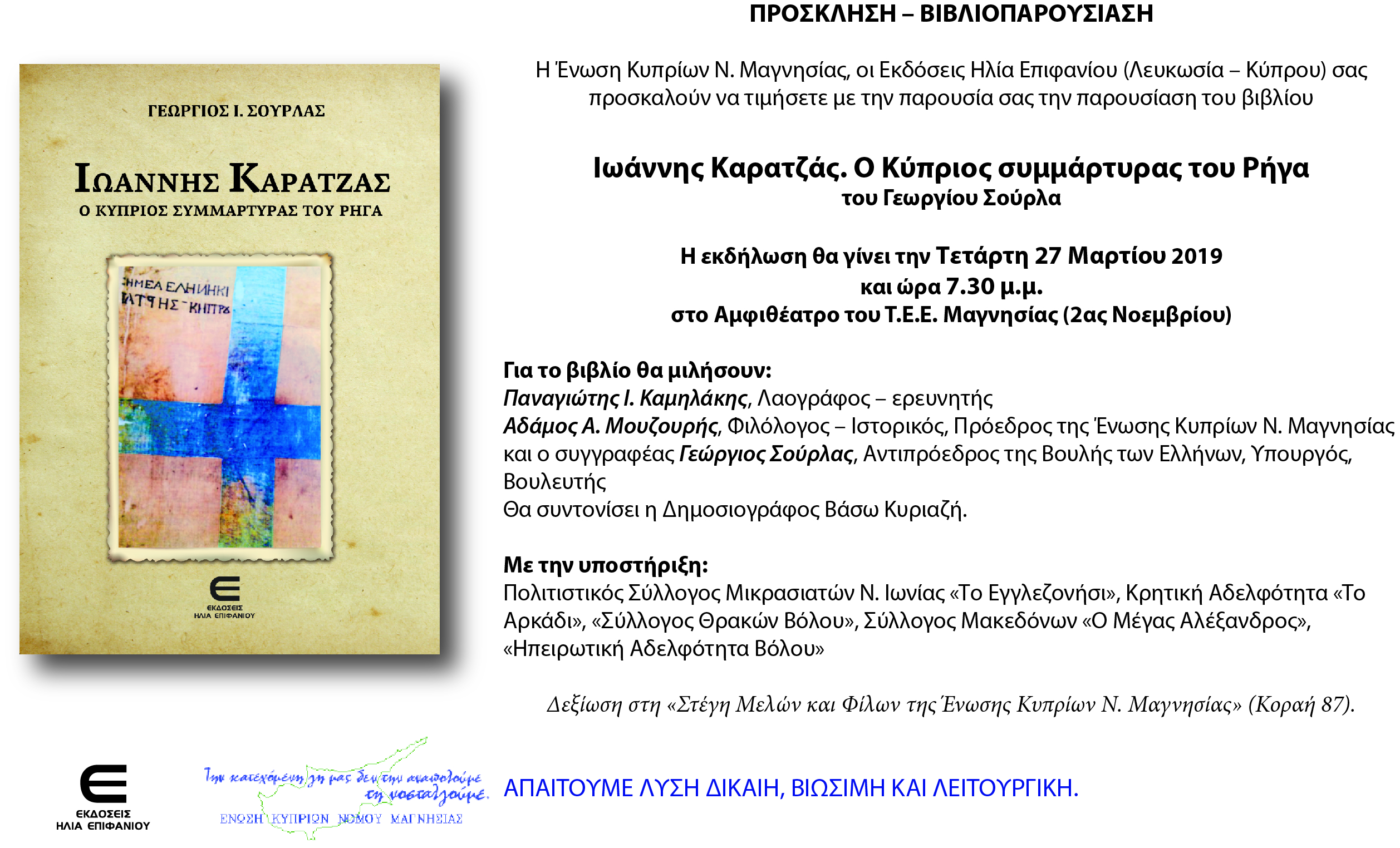 Ο πρώην υπουργός αντιπροεδρος της Βουλής και βουλευτής Μαγνησίας Γιώργος Σούρλας, μας προσκαλεί στην παρουσίαση του βιβλίου του την Τετάρτη 27.3.2019 και ώρα 19:30 στο Αμφιθέατρο του ΤΕΕ Μαγνησίας (2ας Νοεμβρίου).