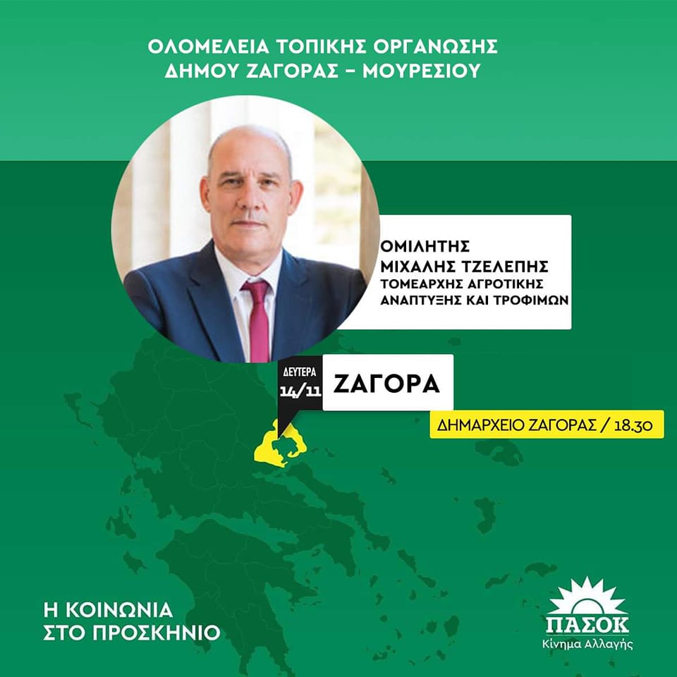 Στην ολομέλεια της Τοπικής Οργάνωσης Δήμου Ζαγοράς-Μουρεσίου, που διοργανώνεται από τη δραστήρια Συντονιστική Επιτροπή σε συνεργασία με την Νομαρχιακή Επιτροπή, την ερχόμενη Δευτέρα 14.11.2022 και ώρα 18:30 στο Δημαρχείο Ζαγοράς, πρόκειται να παραστεί ο Μιχάλης Τζελέπης – Τομεάρχης Αγροτικής Ανάπτυξης και Τροφίμων του ΠΑΣΟΚ – Κινήματος Αλλαγής.