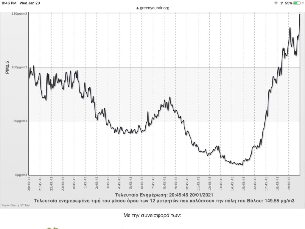 Ακόμα μια εφιαλτική μέρα για την ατμόσφαιρα της πόλης του Βόλου ξημέρωσε σήμερα Πέμπτη 21 Ιανουαρίου. Στις 9 το πρωί ο μέσος όρος των 12 σταθμών μέτρησης του Πανεπιστημίου Θεσσαλίας, που μετρούν τα PM 2,5, έδειξε 86,3 mgr/m3, ενώ η αντίστοιχη τιμή του 24ώρου (από 9 χθες το πρωί μέχρι σήμερα την ίδια ώρα) ήταν 70,44 mgr/m3 με όριο τα 25 mgr/m3!