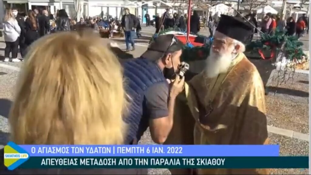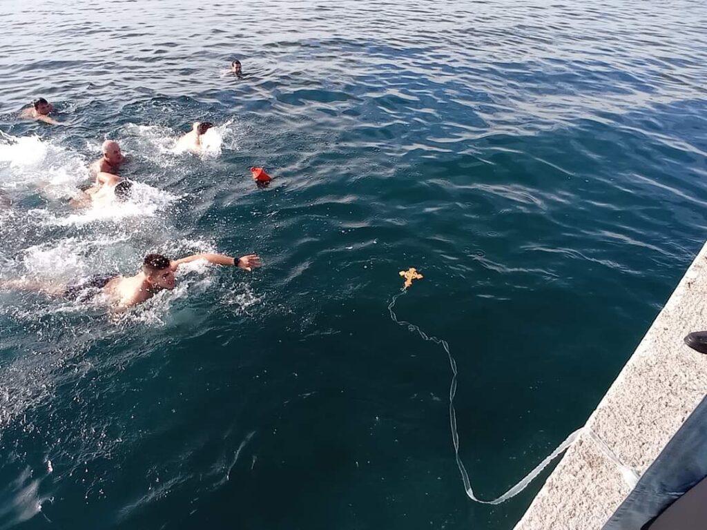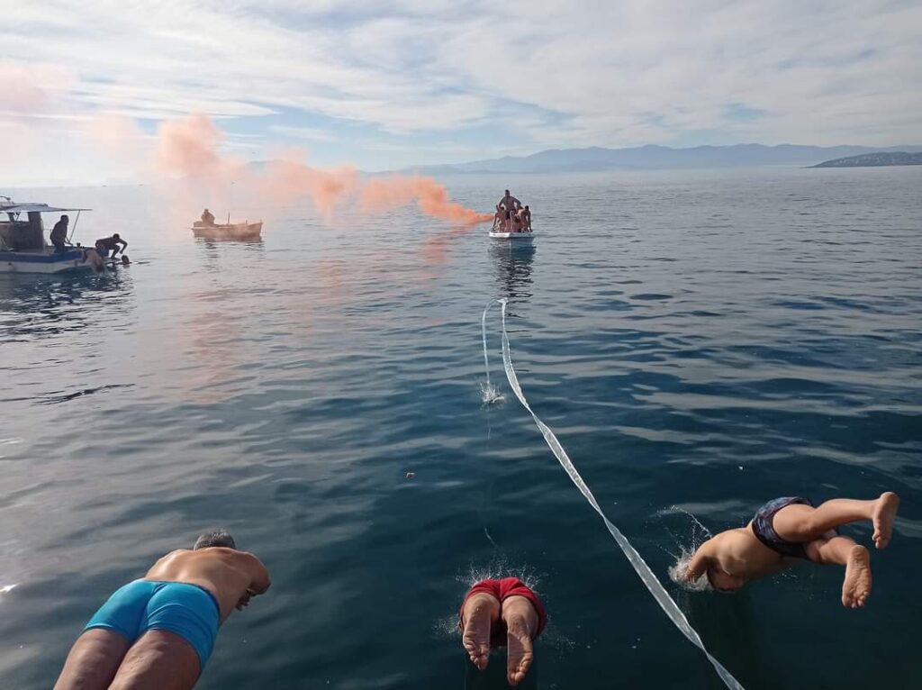 Έξι ήταν κολυμβητές που έπεσαν στα παγωμένα νερά στο Παλιό λιμανι της Σκιάθου για να πιάσουν τον Σταυρό, ενω λιγο πριν οι πιστοι κατεβαζαν τις μασκες και φυλαγαν τον σταυρό από τα ζερια του ιερέα.