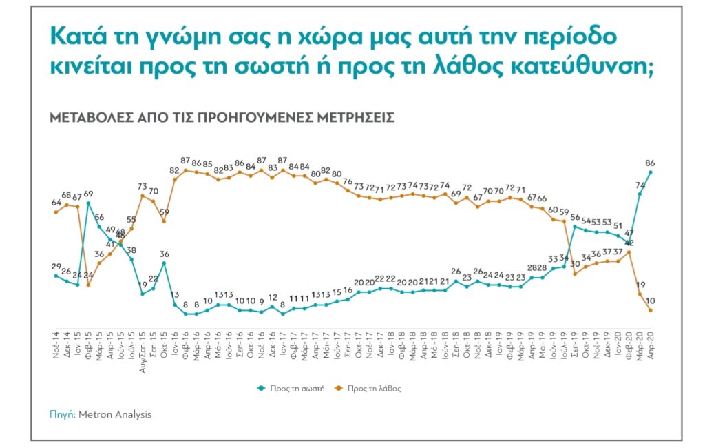 1. Η εταιρεία ερευνών Metron Analysis τα τελευταία οκτώ χρόνια συμπεριλαμβάνει σταθερά, κάθε μήνα, μία ερώτηση στις έρευνές της: “κατά τη γνώμη σας η χώρα μας αυτή την περίοδο κινείται προς τη σωστή ή τη λάθος κατεύθυνση”; Όπως μπορείτε να φανταστείτε, στα τελευταία οκτώ χρόνια, με ελάχιστες εξαιρέσεις (τον Φεβρουάριο του 2015, το φθινόπωρο του 2019) η πλειοψηφία των ερωτηθέντων πιστεύει σταθερά ότι τα πράγματα δεν πηγαίνουν καλά. Από ό,τι αποδεικνύεται στην έρευνα που δημοσιεύει σήμερα η διαΝΕΟσις, όμως, η οποία περιλαμβάνει και πάλι αυτή την ερώτηση, οι Έλληνες δεν έχουν υπάρξει ποτέ τόσο αισιόδοξοι και σίγουροι για το μέλλον, όσο σήμερα.