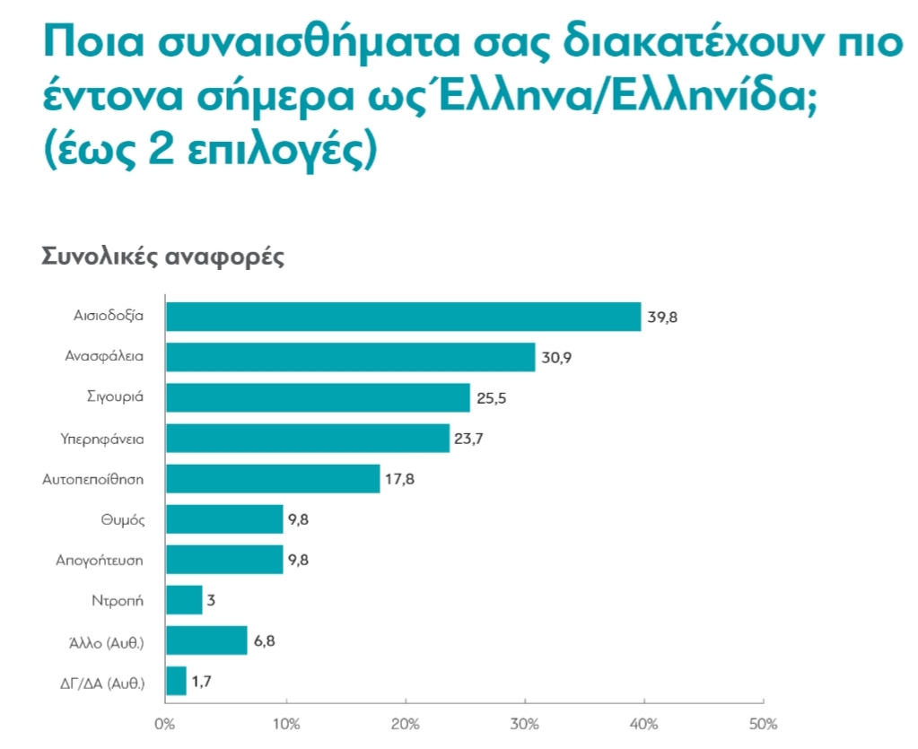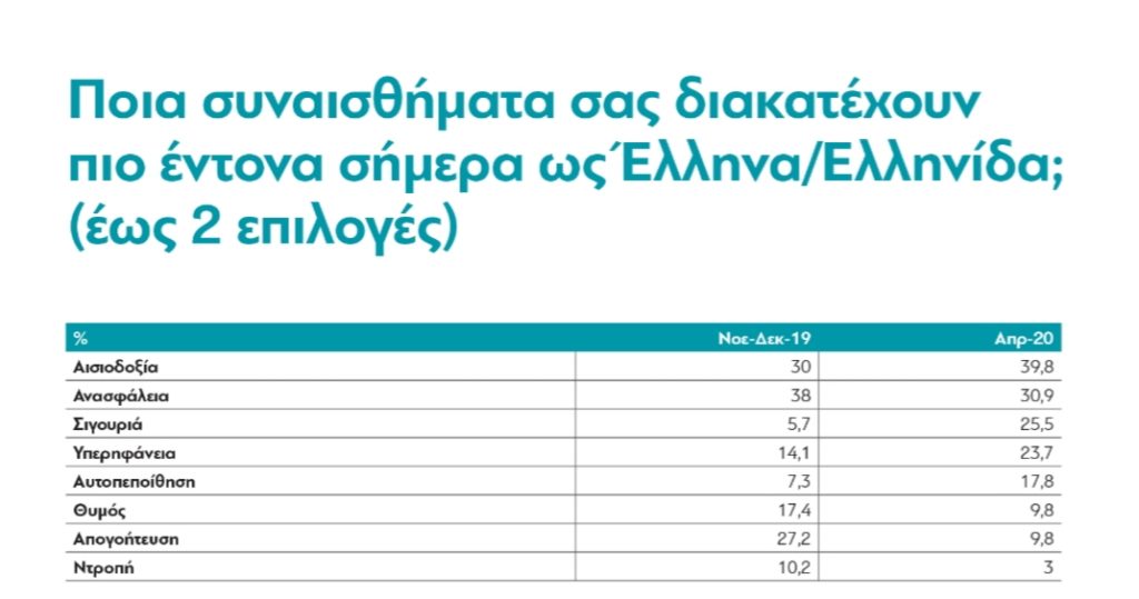 Όταν ζητήσαμε να μας πουν τα δύο κυριότερα αισθήματά τους αυτή τη στιγμή, 40% των ερωτηθέντων ανάφεραν την “αισιοδοξία” (από 30% πέντε μήνες πριν) ενώ 31% επέλεξαν την ανασφάλεια (από 38% τον Δεκέμβριο). Σήμερα πενταπλάσιοι από τότε δηλώνουν ότι νιώθουν σιγουριά, υπερδιπλάσιοι ότι νιώθουν αυτοπεποίθηση. Σχεδόν οι μισοί δηλώνουν το θυμό. Μόνο το ένα τρίτο δηλώνουν σήμερα την απογοήτευση.
