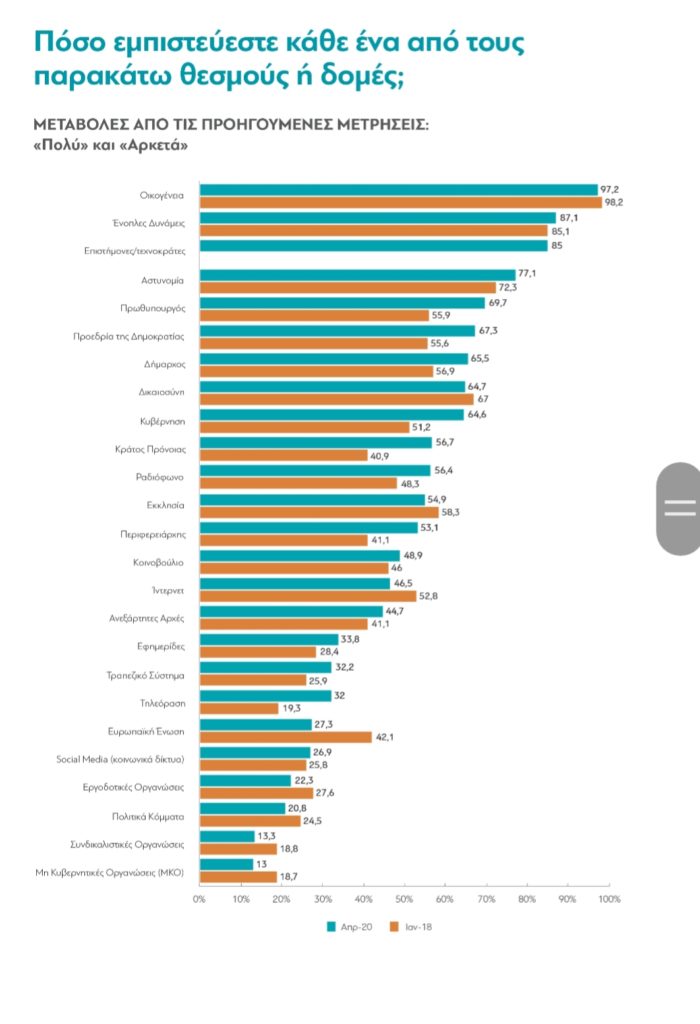 Ο μόνος θεσμός που έχει χάσει ένα μεγάλο ποσοστό από το 2018 είναι η Ευρωπαϊκή Ένωση: μόνο το 27,3% δηλώνουν ότι την εμπιστεύονται σήμερα, από 42,1% δυο χρόνια πριν.