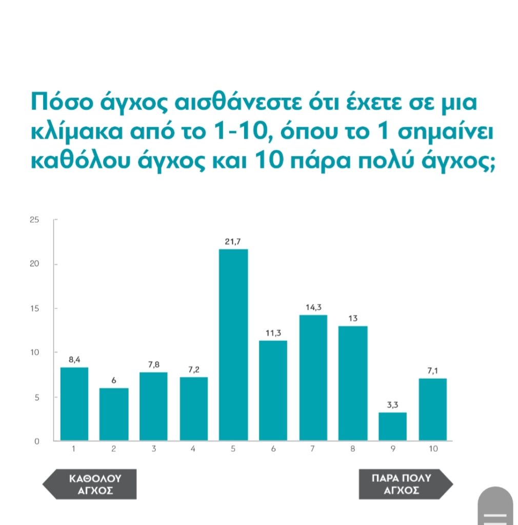 Και οι Έλληνες έχουν άγχος. Στην κλίμακα 1-10 η μέση τιμή είναι 5,5, αλλά το 37,7% των ερωτηθέντων δηλώνουν ότι είναι πολύ αγχωμένοι (7 και άνω).