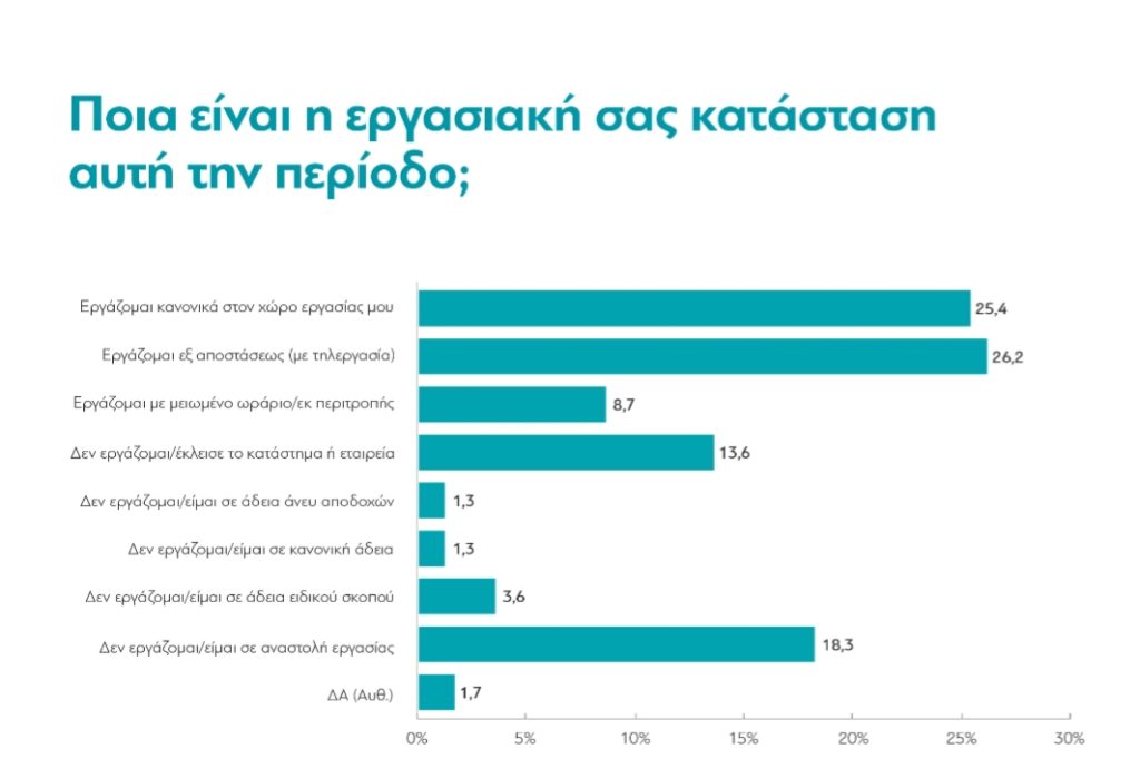 Από ό,τι φαίνεται, περίπου η μισή οικονομική δραστηριότητα στη χώρα έχει παύσει: από αυτούς που εργάζονται στην Ελλάδα, ένας στους τέσσερις (25,4%) εργάζεται κανονικά, άλλος ένας στους τέσσερις (26,2%) με τηλεργασία και οι υπόλοιποι είτε εργάζονται με μειωμένο ωράριο είτε βρίσκονται σε κάποια μορφή άδειας ή αναστολής και δεν εργάζονται καθόλου.