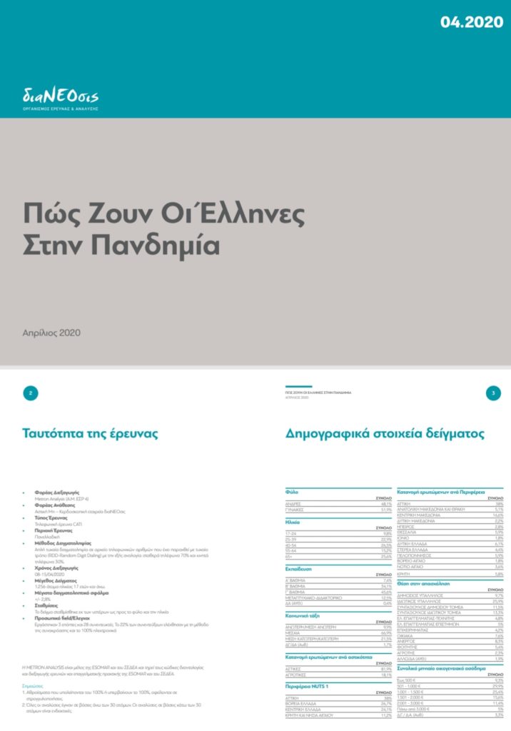Το Δεκέμβριο του 2019, η διαΝΕΟσις σε συνεργασία με την εταιρεία Marc διεξήγαγε την παραδοσιακή σχεδόν-ετήσια έρευνά της “Τι Πιστεύουν Οι Έλληνες”. Τα αποτελέσματα της έρευνας αποτύπωναν γλαφυρά τις βασικές αντιλήψεις και απόψεις του πληθυσμού στα τέλη μιας επεισοδιακής δεκαετίας. Όταν δημοσιεύτηκαν, όμως, ο κόσμος μας είχε ήδη αρχίσει να αλλάζει δραματικά. Ήταν Κυριακή, 8 Μαρτίου. Από τότε τίποτε στις ζωές μας δεν έχει μείνει ίδιο.