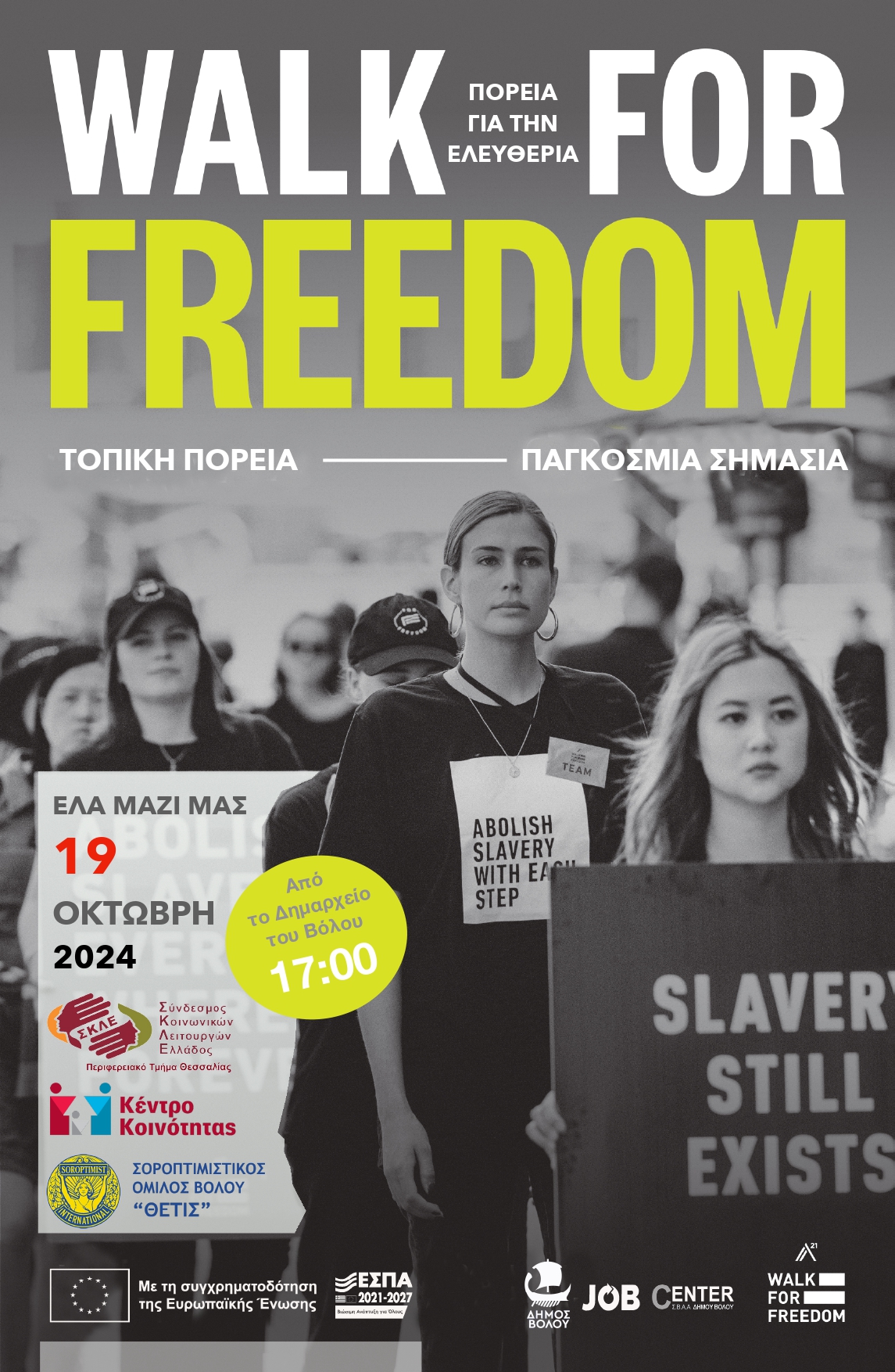 Με αφορμή την Πανευρωπαϊκή Ημέρα κατά της Εμπορίας Ανθρώπων, το 10ο ετήσιο Walk For Freedom θα πραγματοποιηθεί σε εκατοντάδες πόλεις και σε δεκάδες χώρες σε έξι ηπείρους, θέλοντας να ευαισθητοποιήσει τους πολίτες για τα εκατομμύρια των συναναθρώπων μας που παραμένουν σκλαβωμένοι. Οι συμμετέχοντες/συμμετέχουσες θα περπατήσουν σιωπηλά σε μία γραμμή ο ένας πίσω από τον άλλο, σχηματίζοντας αλυσίδες ανθρώπων σε μικρές και μεγάλες πόλεις, σε μεγάλες λεωφόρους ή δρόμους, ντυμένοι στα μαύρα. Στην Ελλάδα, η δράση θα πραγματοποιηθεί σε Βόλο, Θεσσαλονίκη, Αθήνα, Πάτρα, Πύργο Ηλείας και Λευκάδα.