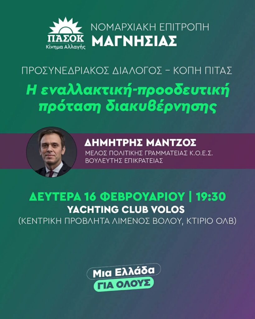 Τη Δευτέρα 16 Φεβρουαρίου και ώρα 19:30 στο Yachting Club Volos, στο κτήριο του ΟΛΒ, θα πραγματοποιηθεί εκδήλωση προσυνεδριακού διαλόγου και Κοπή πίτας, με ομιλητή τον Κοινοβουλευτικό Εκπρόσωπο και Βουλευτή Επικρατείας κ. Δημήτρης Μάντζος.