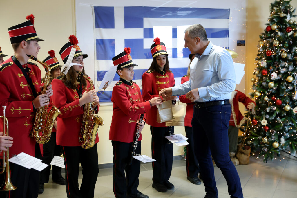 Μια ευχάριστη έκπληξη επιφύλαξαν τα παιδιά της Φιλαρμονικής μπάντας του δήμου Αλμυρού στον Περιφερειάρχη Θεσσαλίας κ. Δημ. Κουρέτα, καθώς εμφανίστηκαν σήμερα Τρίτη το πρωί στο γραφείο του με υπέροχες κόκκινες στολές με σιρίτια και πηλήκια, λέγοντας με τον δικό τους ξεχωριστό τρόπο τα κάλαντα και ευχήθηκαν Καλή Χρονιά, θυμίζοντας πραγματικούς μικρούς καρυοθραύστες. Η εμφάνισή τους, η επίδοσή και η ηλικία τους έκανε ιδιαίτερη εντύπωση στον Περιφερειάρχη και στους συνεργάτες του, αφού από την 20μελή μπάντα το μικρότερο παιδάκι ήταν ένα κοριτσάκι 9 ετών της Δ’ Δημοτικού που έπαιζε φλάουτο και το μεγαλύτερο ένα αγόρι της Α’ Λυκείου. «Πέρυσι ήρθαμε μόλις 7 παιδιά και φέτος είμαστε 20. Του χρόνου ελπίζουμε να σας επισκεφτούμε περισσότεροι» είπε χαρακτηριστικά η κα Μαρία Αγγέλη, αρχιμουσικός της μπάντας, η οποία δέχτηκε συγχαρητήρια για την προσπάθεια και το επίπεδο των παιδιών. Το εντυπωσιακό είναι ότι η Φιλαρμονική Μπάντα Αλμυρού είναι σε δράση τον τελευταίο μόλις χρόνο, μετά από διακοπή 8 ετών. Ο Δημ. Κουρέτας συνεχάρη τα παιδιά για την προσπάθειά τους, συνομίλησε μαζί τους και εντυπωσιάστηκε από το ζήλο τους για καθημερινές πρόβες, όλο το χρόνο. Αρκετά παιδιά του δήλωσαν ότι θέλουν να γίνουν μουσικοί, όταν μεγαλώσουν. Ο Περιφερειάρχης, παρουσία του Αντιπεριφερειάρχη Πρωτογενούς Τομέα και Αγροτικής Οικονομίας κ. Δημήτρη Τσέτσιλας και του Συντονιστή της Πολιτικής Προστασίας κ. Δημήτρη Μπίκου, μοίρασε αναμνηστικά δώρα στα παιδιά, καθώς και ένα χρηματικό πόσο για την υποστήριξη της Φιλαρμονικής Αλμυρού ως είθισται κατά τα κάλαντα και ευχήθηκε Καλή Χρονιά σε όλους.