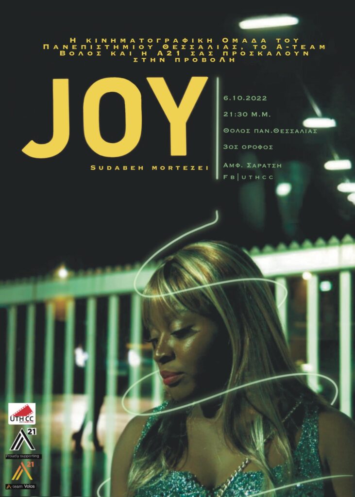 Η Α21, η εθελοντική ομάδα του Ateam στον Βόλο σε σύμπραξη της Κινηματογραφικής κοινότητας των φοιτητών Πανεπιστημίου Θεσσαλίας θα προβάλλουν την ταινία “JOY”, με δωρεάν είσοδο προς όλους. Η προβολή θα πραγματοποιηθεί ενόψει του 8ου περπατήματος για την ελευθερία, #WALKFORFREEDOM, και της πανευρωπαϊκής ημέρας για την καταπολέμηση του ανθρώπινου εμπορίου. Θα προλογίσει εκπρόσωπος της Α21.