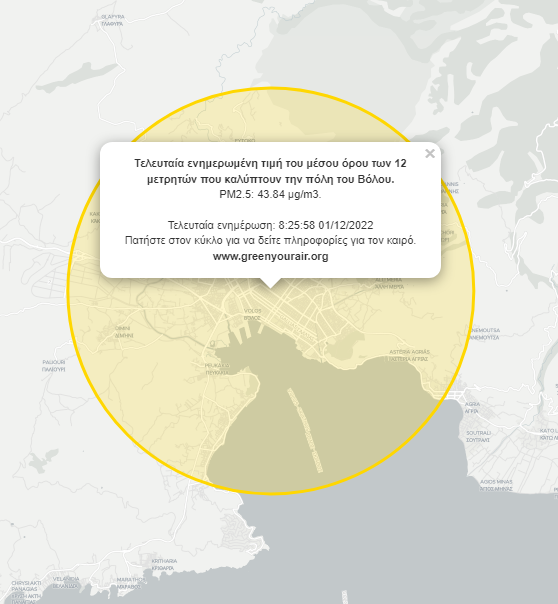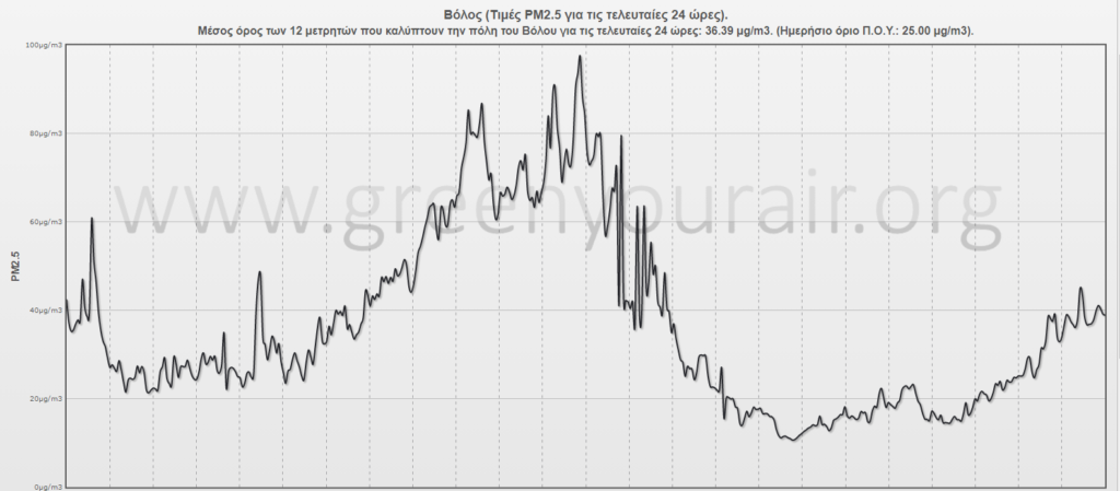 Σύμφωνα με τις μετρήσεις του Σταθμού του Υπουργείου Περιβάλλοντος που λειτουργεί με την ευθύνη της Περιφέρειας Θεσσαλίας και είναι εγκατεστημένος στο 1ο Δημοτικό Σχολείο, τα αιωρούμενα σωματίδια  pm 10 κατέγραψαν στις 28  Νοεμβρίου μέσο όρο τιμών 18 μg/m3, στις 29 Νοεμβρίου μέσο όρο τιμών 21 μg/m3 και στις 30 Νοεμβρίου μέσο όρο τιμών 28  μg/m3.