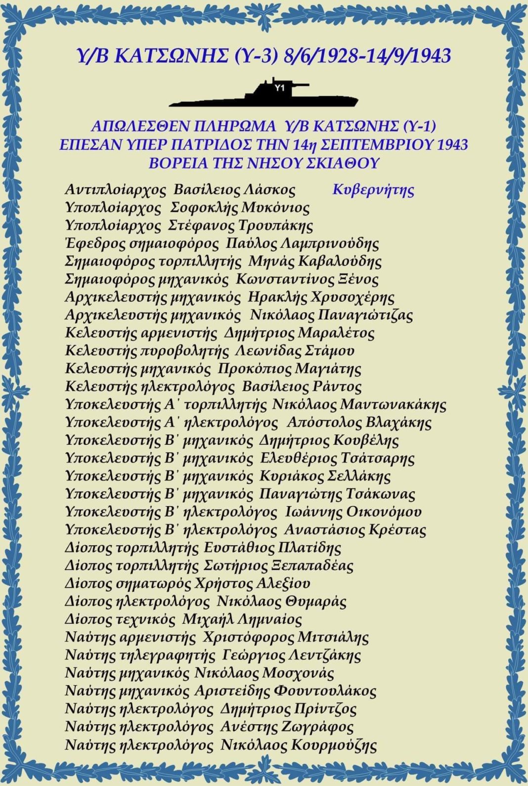 Το Υποβρύχιο Κατσώνης Υ1 στις 14 Σεπτεμβρίου 1943 ενώ έπλεε στην επιφάνεια βορείως της Νήσου Σκιάθου, το αντελήφθη γερμανική κορβέτα U.J. 2101 και παρά την ταχεία του κατάδυση δέχτηκε πολλές δέσμες βομβών που του προξένησαν σοβαρές ζημιές. Ο κυβερνήτης διέταξε ανάδυση και επίθεση διά του πυροβόλου. Παρά τον άνισο αγώνα, από τα δραστικά πυρά του εχθρού το Υ/Β βυθίστηκε. Από το πλήρωμα του, 32 παρασύρθηκαν στον υγρό του τάφο, 15 αιχμαλωτίσθηκαν ενώ ο ύπαρχος Ηλ. Τσουκαλάς και οι υπαξιωματικοί Τσίγκρος και Αντωνίου διέφυγαν στην Σκιάθο κολυμπώντας επί 9 ώρες και κατόπιν περιπετειών επανήλθαν στην Μ. Ανατολή. Με βασιλικό διάταγμα στις 4 Δεκεμβρίου 1943 το ηρωικό απωλεσθέν πλήρωμα προήχθη επ’ ανδραγαθία στον επόμενο βαθμό.