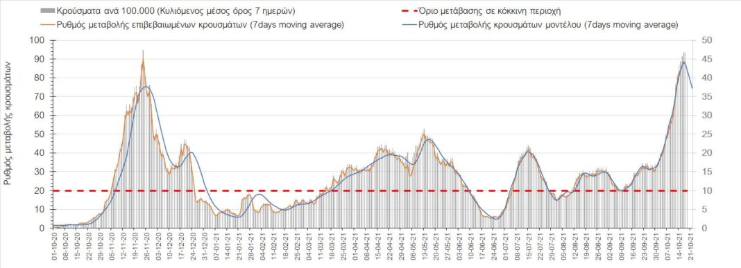 Η πορεία της μέσης εβδομαδιαίας τιμής των κρουσμάτων, καθώς και του κυλιόμενου μέσου όρου 7 ημερών του αριθμού των κρουσμάτων ανά 100.000 πληθυσμού, όπως έχουν καταγραφεί από τον ΕΟΔΥ και η αναμενόμενη πορεία τους όπως προδιαγράφεται από την υπολογιστική πλατφόρμα CORE για την Ελληνική επικράτεια μέχρι τις 20 Οκτωβρίου, αποτυπώνονται στο Σχήμα 4.