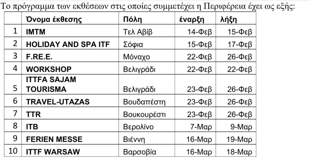 Το πρόγραμμα των εκθέσεων στις οποίες συμμετέχει η Περιφέρεια έχει ως εξής: