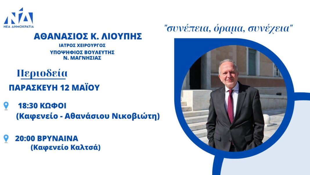 Συνεχίζει τις περιοδείες του σε όλη τη Μαγνησία ο Βουλευτής Ν. Μαγνησίας της Νέας Δημοκρατίας και εκ νέου υποψήφιος κ. Αθανάσιος Λιούπης, στο πλαίσιο της παρουσίασης του κυβερνητικού έργου.