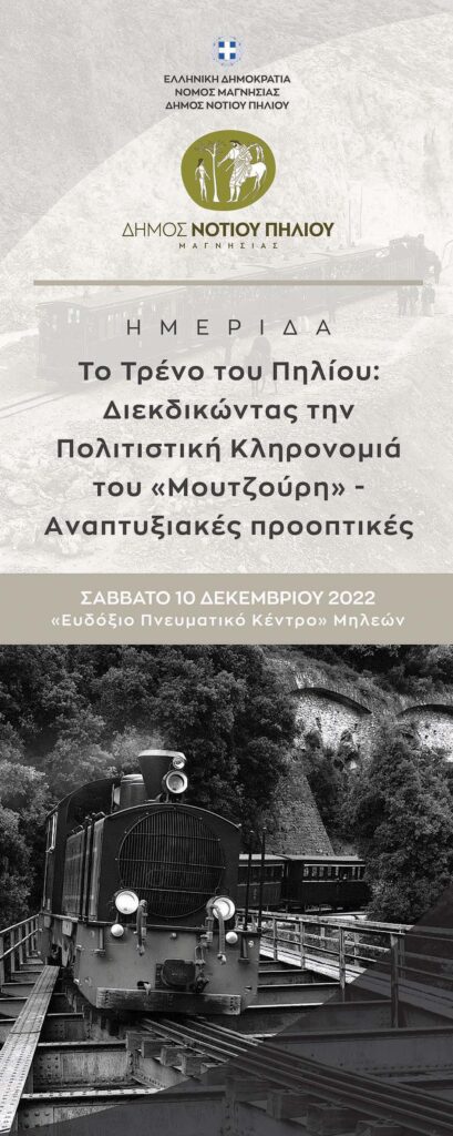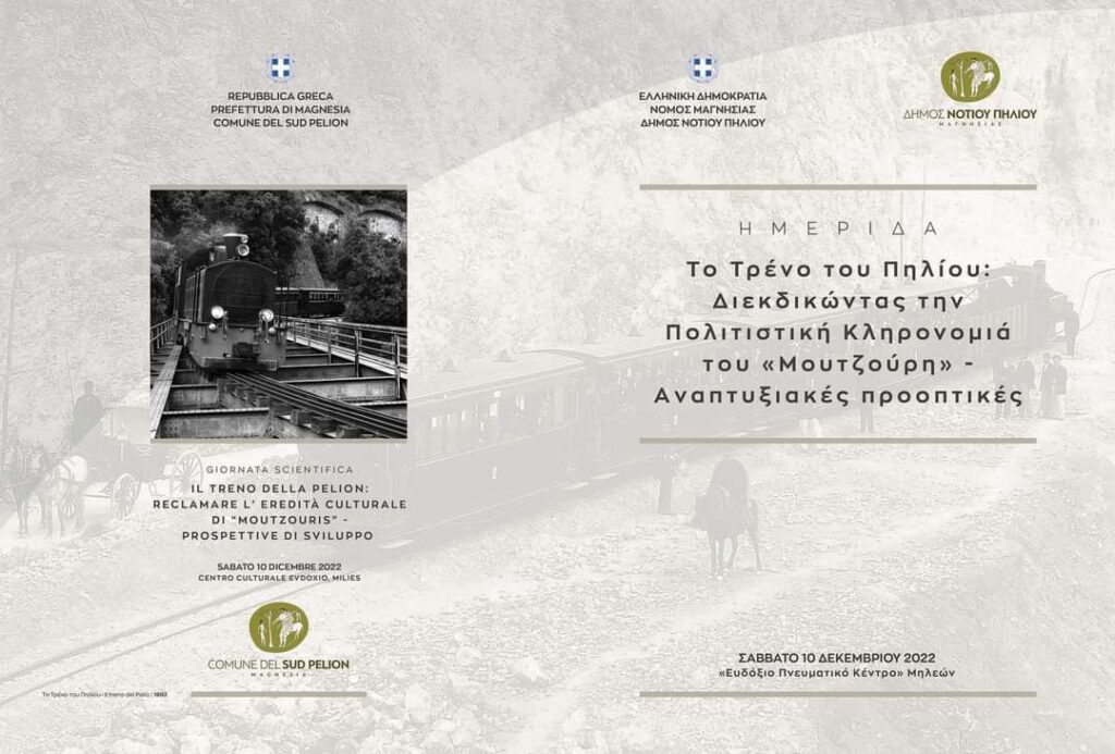Ημερίδα με θέμα «Το τρένο του Πηλίου: Διεκδικώντας την Πολιτιστική Κληρονομιά του «Μουτζούρη» – Αναπτυξιακές προοπτικές» διοργανώνει ο Δήμος Νοτίου Πηλίου το Σάββατο 10 Δεκεμβρίου 2022 στο «Ευδόξιο Πνευματικό Κέντρο» Μηλεών. Οι προσκεκλημένοι ομιλητές θα αναδείξουν άγνωστες -έως τώρα- πτυχές της «διαδρομής» του «Μουτζούρη» στον τόπο και στον χρόνο:
