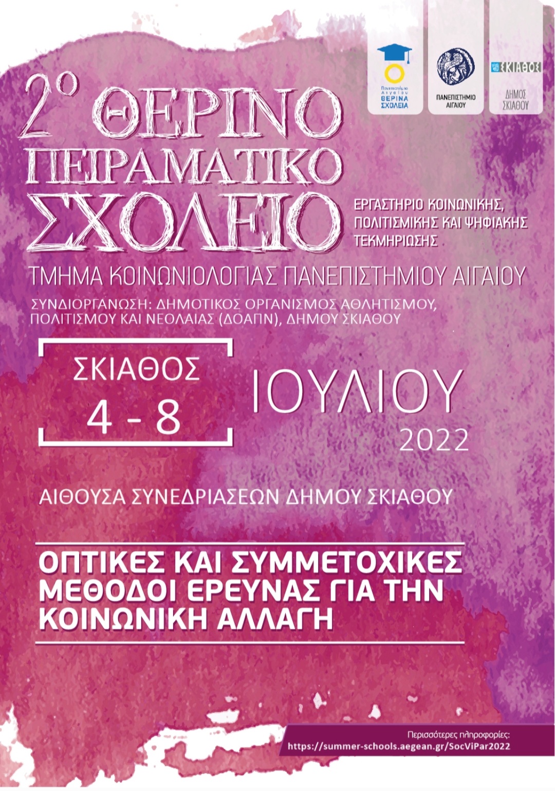 Με μεγάλη μας χαρά σάς προσκαλούμε στο 2ο Θερινό Πειραματικό Σχολείο με θέμα “Οπτικές και Συμμετοχικές Μέθοδοι Έρευνας για την Κοινωνική Αλλαγή – SocViPar2022”, το οποίο θα διεξαχθεί από τις 4 έως τις 8 Ιουλίου 2022 στη Σκιάθο. Το θερινό σχολείο συνδιοργανώνει το Πανεπιστήμιο Αιγαίου σε συνεργασία με το Εργαστήριο Κοινωνικής, Πολιτισμικής και Ψηφιακής Τεκμηρίωσης με Επιστημονική Υπεύθυνη την Καθηγήτρια Ψυχολογίας του Τμήματος Κοινωνιολογίας του Πανεπιστημίου Αιγαίου, κα Ζήση Αναστασία και τον Δημοτικό Οργανισμό Αθλητισμού Πολιτισμού και Νεολαίας (Δ.Ο.Α.Π.Ν) Δήμου Σκιάθου.