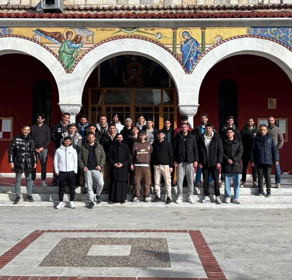 Τον αντιπρόεδρο της ΠΑΕ, κ. Βασίλη Βενέτη, το προπονητικό μας επιτελείο και τους ποδοσφαιριστές μας υποδέχθηκε ο Πατέρας Νεκτάριος, ο οποίος ευχήθηκε σε όλους υγεία, ευτυχία και… το πρωτάθλημα!