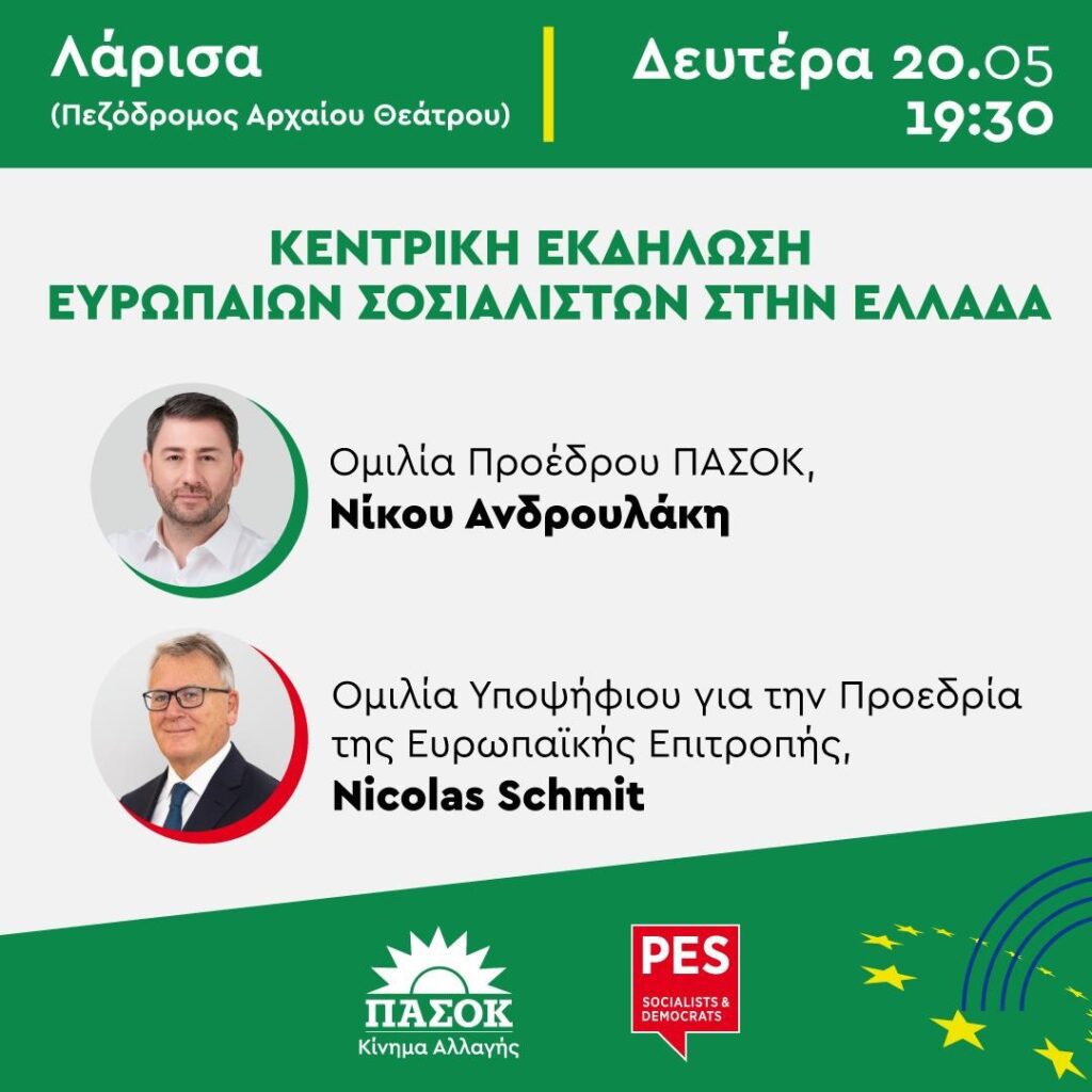 Ο παλμός του αγώνα των Ευρωπαίων Σοσιαλιστών και του ΠΑΣΟΚ-Κινήματος Αλλαγής για τις ευρωεκλογές της 09ης Ιουνίου στην Ελλάδα, χτυπά στη Θεσσαλία. Την ερχόμενη Δευτέρα 20 Μαΐου, στις 19.30 το απόγευμα, ο Πρόεδρος του ΠΑΣΟΚ, Νίκος Ανδρουλάκης, και ο υποψήφιος των Ευρωπαίων Σοσιαλιστών για την προεδρία της Ευρωπαϊκής Επιτροπής, Νίκολας Σμιτ, δίνουν το στίγμα των ευρωεκλογών από την Λάρισα, στον πεζόδρομο του αρχαίου θεάτρου (οδός Παπαναστασίου).