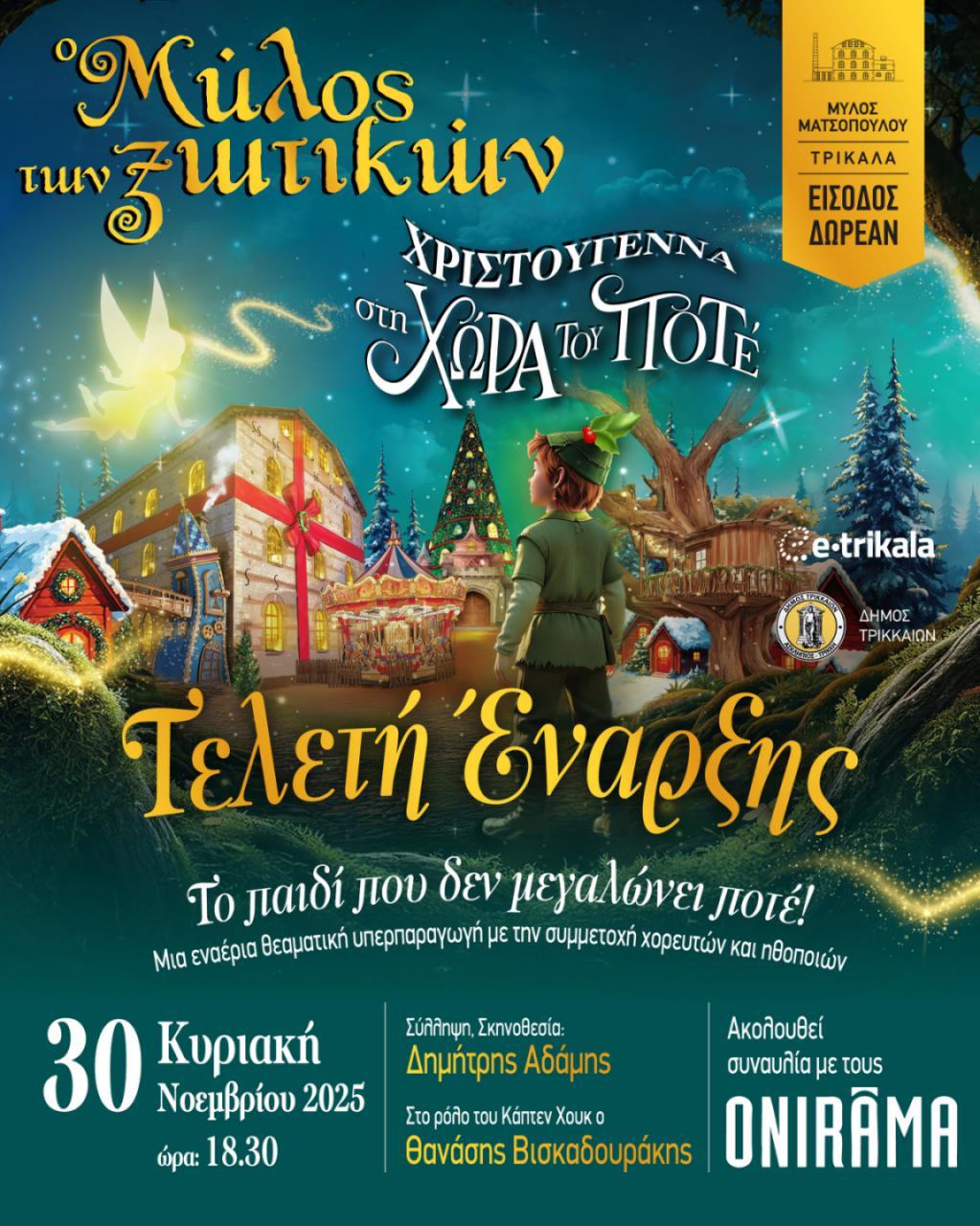 ”Το παιδί που δεν μεγαλώνει ποτέ” τιτλοφορείται η τελετή έναρξης του14ου Μύλου των Ξωτικών, που για φέτος θα πραγματοποιηθεί την Κυριακή 30Νοεμβρίου 2025.