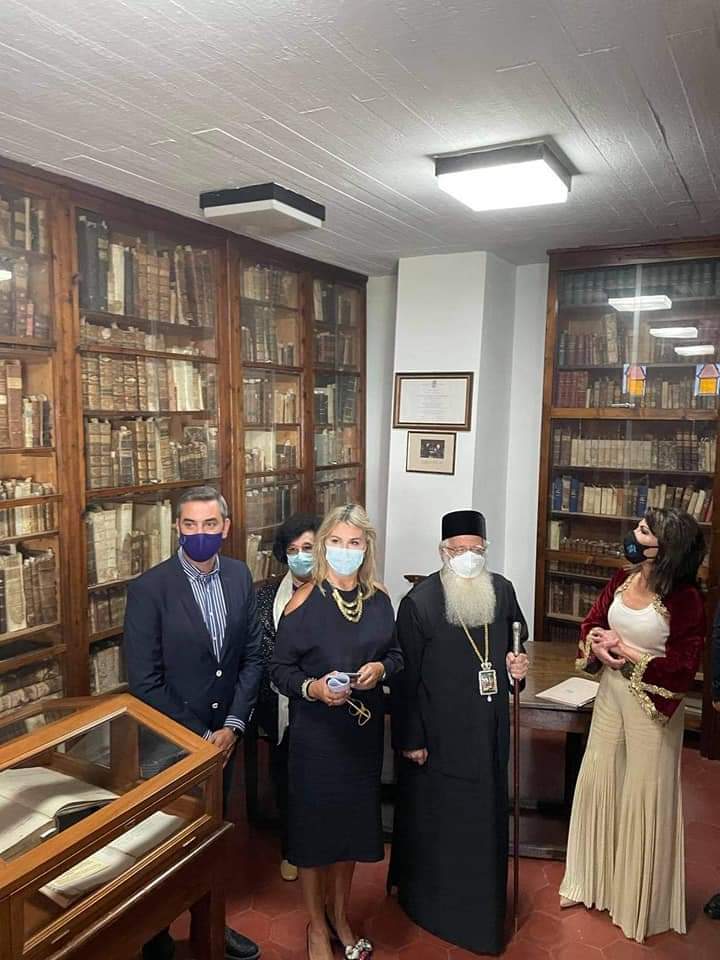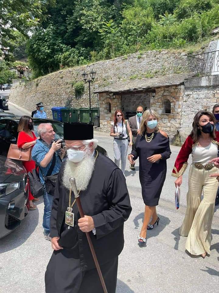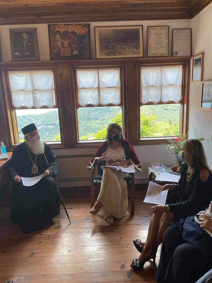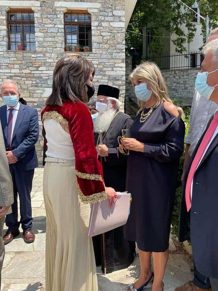 Η κ. Αγγελοπούλου ξεναγήθηκε στον Ιερό Ναό Παμμεγίστων Ταξιαρχών Μηλεών, που έχει χαρακτηριστεί, ως η «Αγία Λαύρα» του Πηλίου. Και αυτό γιατί στις 7 Μαΐου 1821 ο Μηλιώτης Διδάσκαλος του Γένους, Άνθιμος Γαζής, κήρυξε μετά τη Θεία Λειτουργία τη Θεσσαλική Επανάσταση, στην Βιβλιοθήκη των Μηλεών και κατέληξε στην πλατεία, όπου έκανε δηλώσεις μαζί με τους εκκλησιαστικούς και πολιτικούς παράγοντες, αλλά και τα μέλη της Επιτροπής.