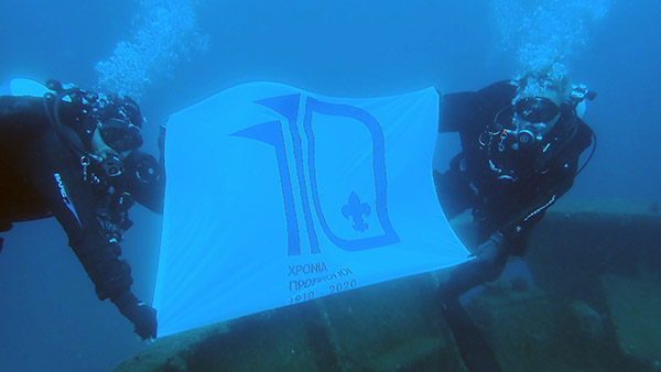 Στο ναυάγιο “Χριστόφορος” (-45μετρα) στον Πάνορμο Σκόπελου η σημαία των 110 χρόνων του Ελληνικού προσκοπισμού, στο μεγαλύτερο βάθος που έχει βρεθεί μέχρι σήμερα, μαζί με το 1ο Σύστημα Ναυτοπροσκόπων Σκοπέλου. Στη φωτογραφία (Δ) ο Θανάσης Φαδάκης, Αρχηγός 1ου Συστήματος Ναυτοπροσκόπων Σκοπέλου και (Α) ο πρόσκοπος Τάσος Κτίστης, πρεσβεύοντας την ειρήνη και τον διάλογο μεταξύ των λαών!