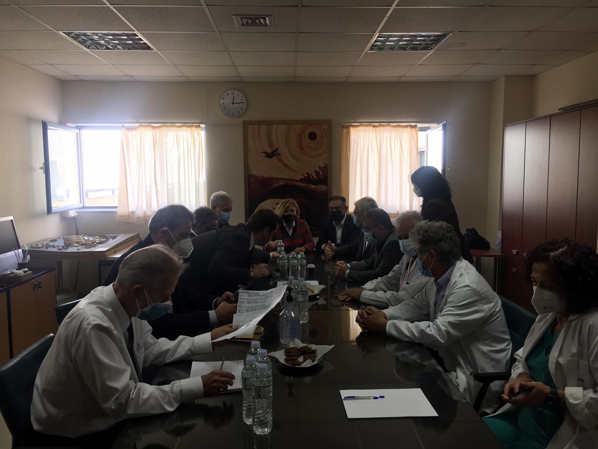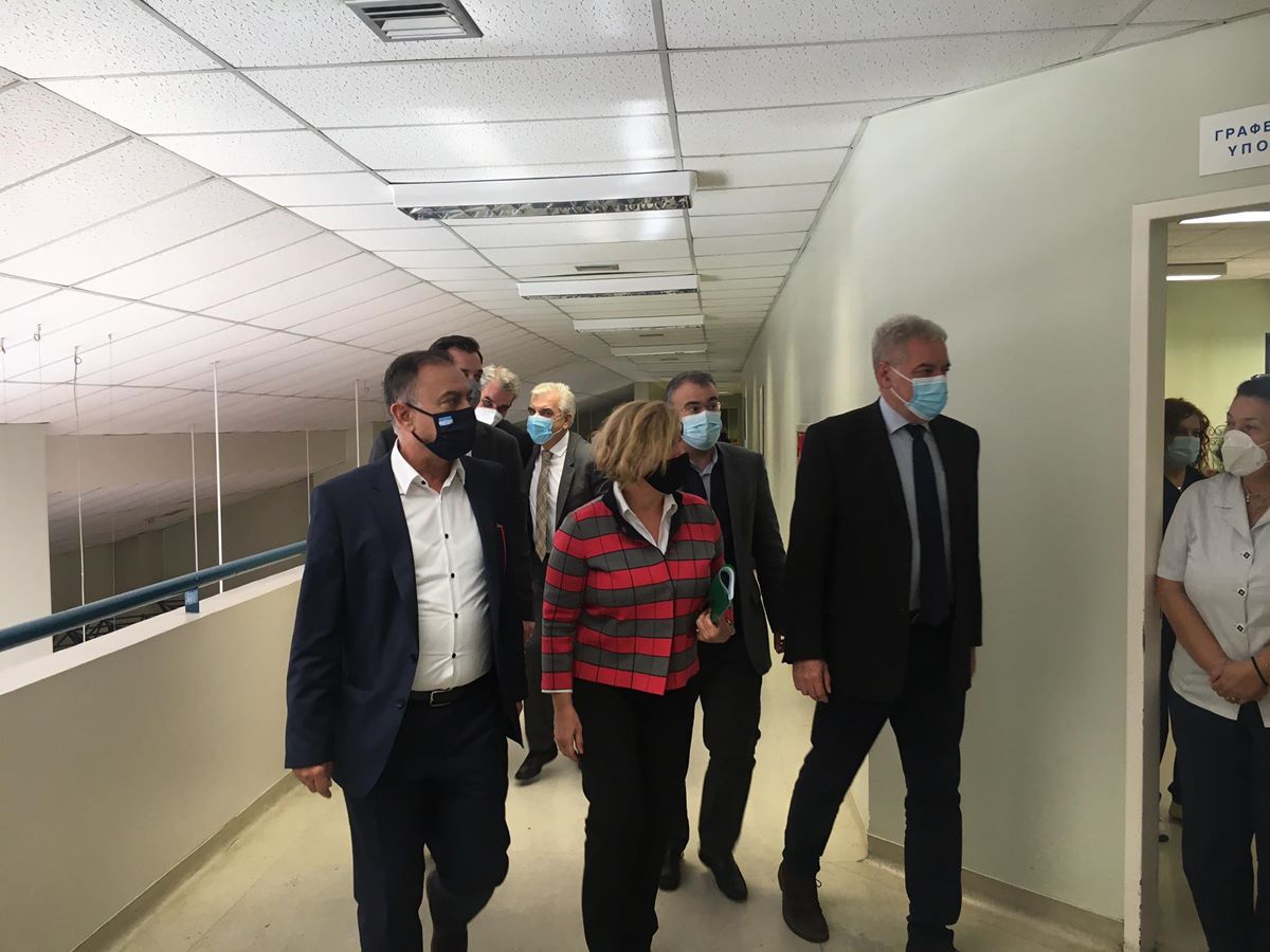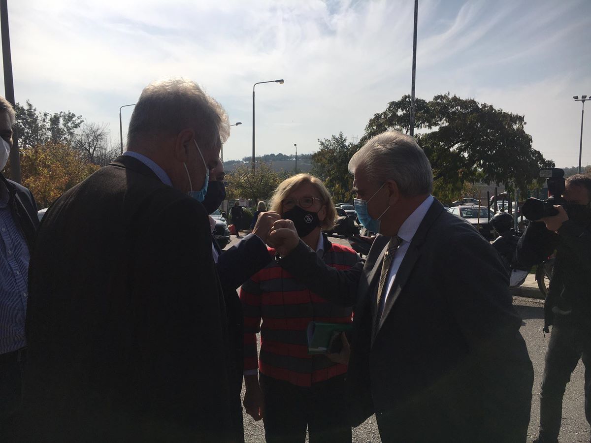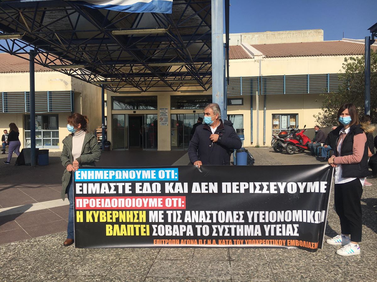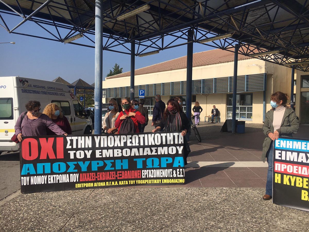 Να σημειωθεί ότι στην είσοδο του ΠΓΝΛ ανέμεναν εργαζόμενοι του νοσοκομείου με πανό, διαμαρτυρόμενοι κατά του υποχρεωτικού εμβολιασμού.